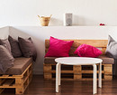 - Если нужно сидение длиннее — трех- или четырехместное, схема работы будет такой же. Но в основании будет не одна стопка палет, а две или три. Между собой по горизонтали их скрепляют встык с помощью досок и металлических уголков.
