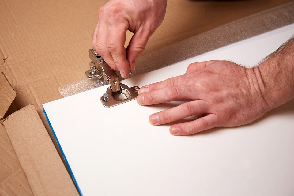 Как прикрепить дверцу к шкафу на петлях? Если петель 3 и больше, закрепите все чашки и ответную планку для самой верхней. Остальные ответные планки соедините с чашками, но пока не крепите к мебели. Так будет проще повесить высокую или тяжелую дверь. Для небольшого фасада на двух петлях можно сразу зафиксировать обе ответные планки. Не вкручивайте крепеж до конца, пока не повесите дверь.
