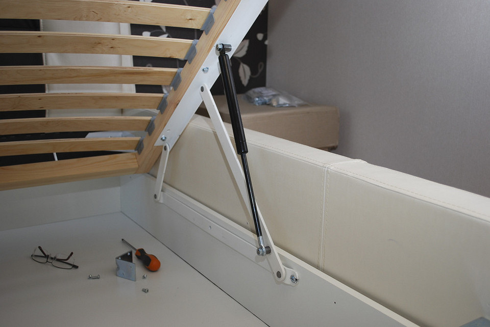 Как ставить газлифты на кровать? Это можно делать как после сборки каркаса, так и до установки подъемных механизмов на него. Пожалуйста, ориентируйтесь в этом вопросе на производителя мебели. Но механика действий будет одинаковой.