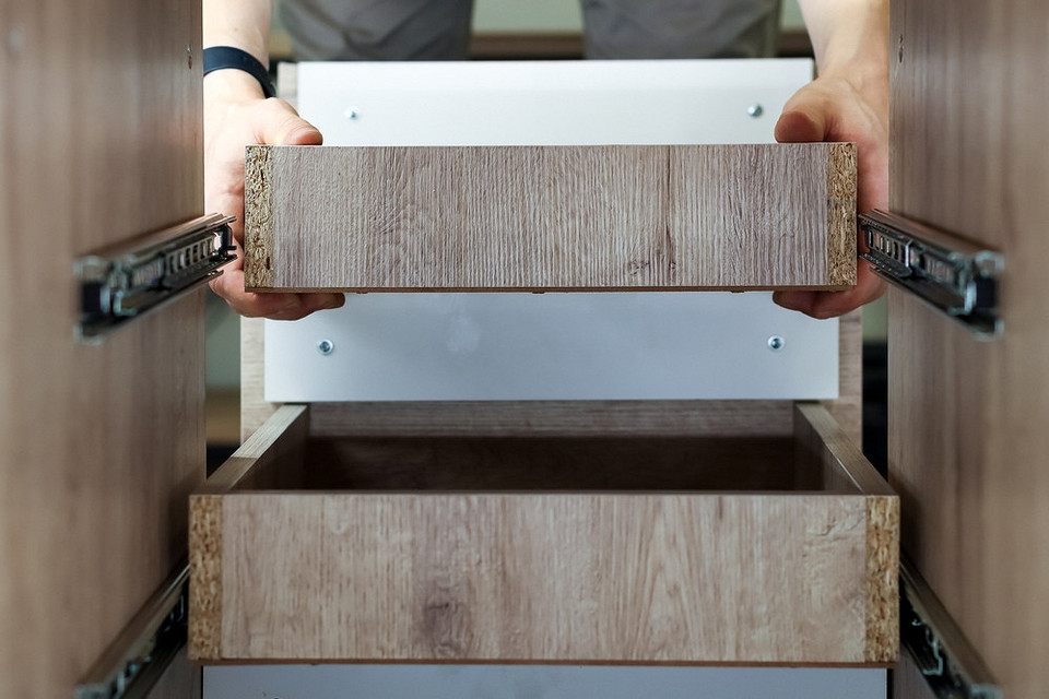 - Конструкция включает две направляющие, которые крепят к стенкам шкафа, и пару полозьев на самих ящиках. В зависимости от типа механизма — роликовый или шариковый — полозья крепят ко дну ящика или к его боковинам.