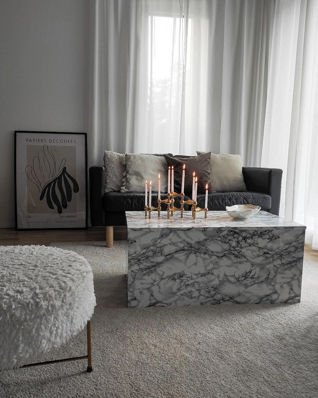 На черном фоне здорово будет смотреться контрастный текстиль или декор: например, можно повесить над мягкой группой несколько постеров со светлым фоном. Если вы хотите усилить ощущение брутальности, сочетайте черную софу с металлом, бетоном или стеклом.