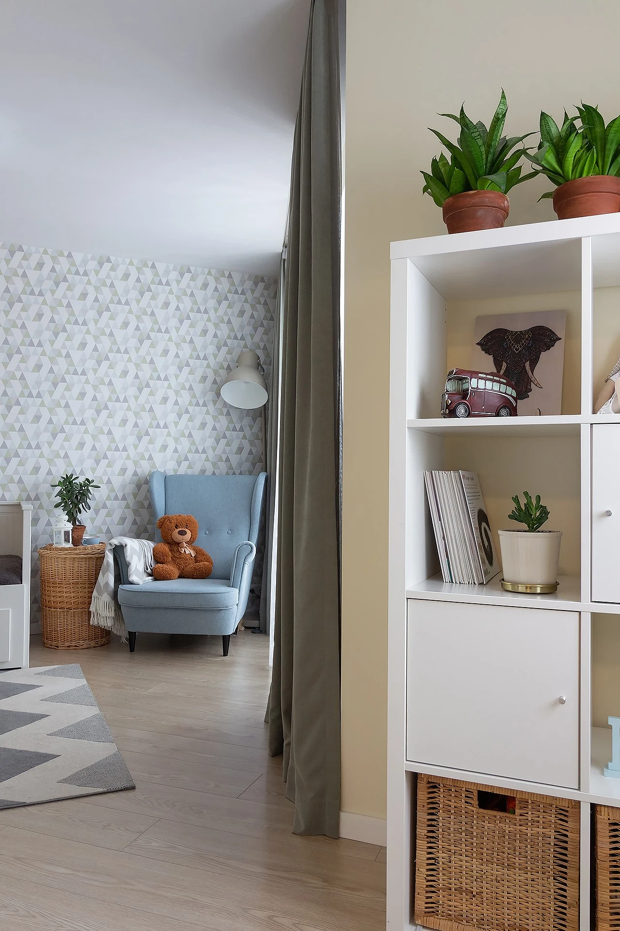 Место для родителей понадобится, если ребенок еще совсем маленький либо уже учится в начальной школе. Скорее всего, ему придется помогать с домашними заданиями, и хорошо, если для этого не придется стоять или приносить стул из соседней комнаты. Родительское кресло должно быть достаточно высоким, удобным и вписываться в стиль комнаты.