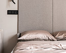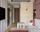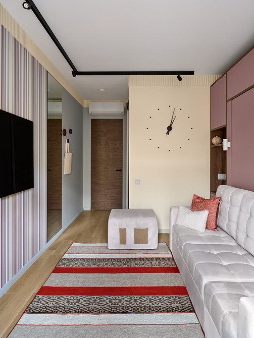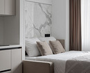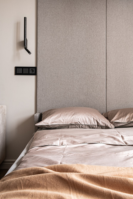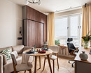 Эта однокомнатная квартира предназначена для молодой семьи. В комнате предстояло объединить много функций: спальни, гостиной, кабинета. Дизайнер Ксения Муравьева предложила мебель-трансформер — в сложенном виде это выглядит как диван со шкафом, в разложенном получается кровать. Вместо изголовья можно положить диванные подушки. По бокам от кровати-дивана — два узких шкафчика. Вместо прикроватных тумбочек — ниши внутри шкафов.