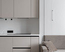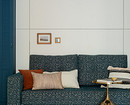Площадь комнаты с кухней в этой студии меньше 15 квадратов, а уместить требовалось очень много — и диван, и спальное место, и рабочее место, и хранение. Дизайнер Галина Овчинникова решила организовать спальное место в виде трансформера — в сложенном виде кровать выглядит как шкаф, при откидывании матраса получается комфортная двуспальная кровать. Антресольные шкафчики и боковая секция предназначены для хранения. На стене монтированы панели, обитые той же тканью, что и каркас кровати, создавая визуальную гармонию.