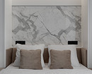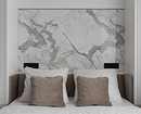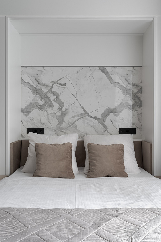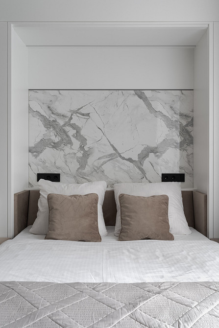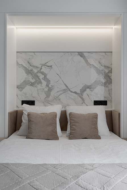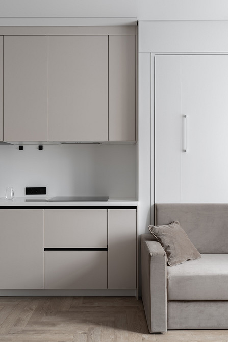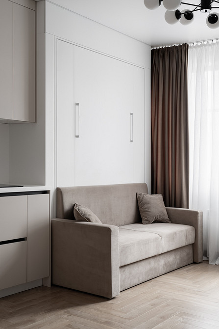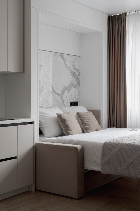 Еще один проект студии, на этот раз для девушки. Дизайнер Изабелла Ивлиева спроектировала современный интерьер с функциональными решениями: в студии много систем хранения, продуманная и укомплектованная кухня, обеденная группа, рабочее место и диван-кровать-шкаф. В сложенном виде это удобный диван с мебельной панелью, в разложенном — полноценная двуспальная кровать. На стене за изголовьем кровати сделали акцент с помощью МДФ-панели под мрамор и монтировали скрытую подсветку для вечернего уютного света.