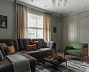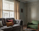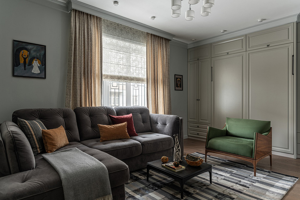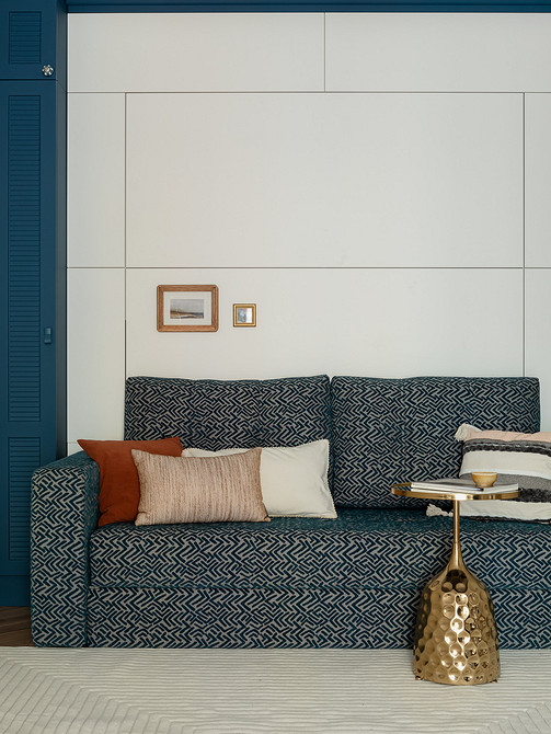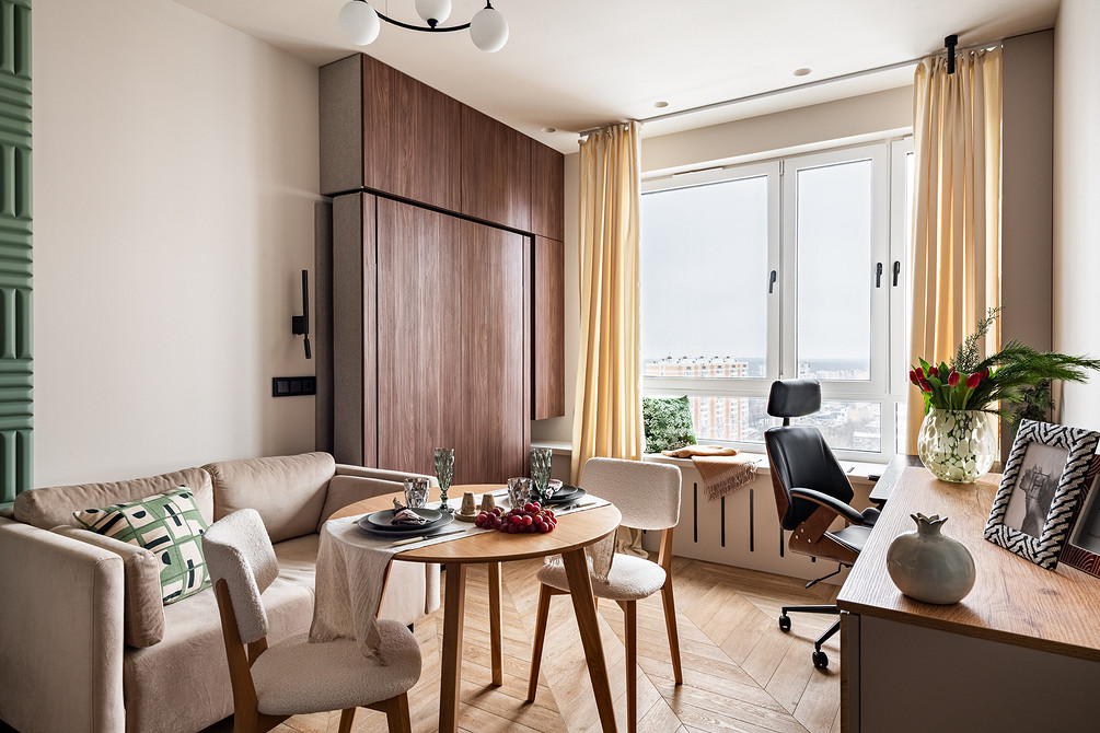 В этой однокомнатной квартире семейная пара хотела объединить функции гостиной и спальни в единственной комнате. При этом стандартное решение — раскладной диван — не рассматривали. В итоге в комнате сделали гостиную, две стены заняли системы хранения. Один из шкафов — с откидной кроватью. В закрытом виде она выглядит как мебельная панель, в открытом — полноценная кровать с мягким изголовьем и парой бра над ним. Чтобы подготовиться ко сну, достаточно отодвинуть кресло.