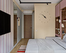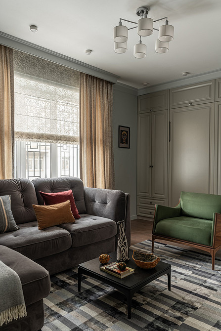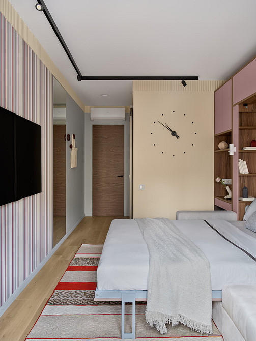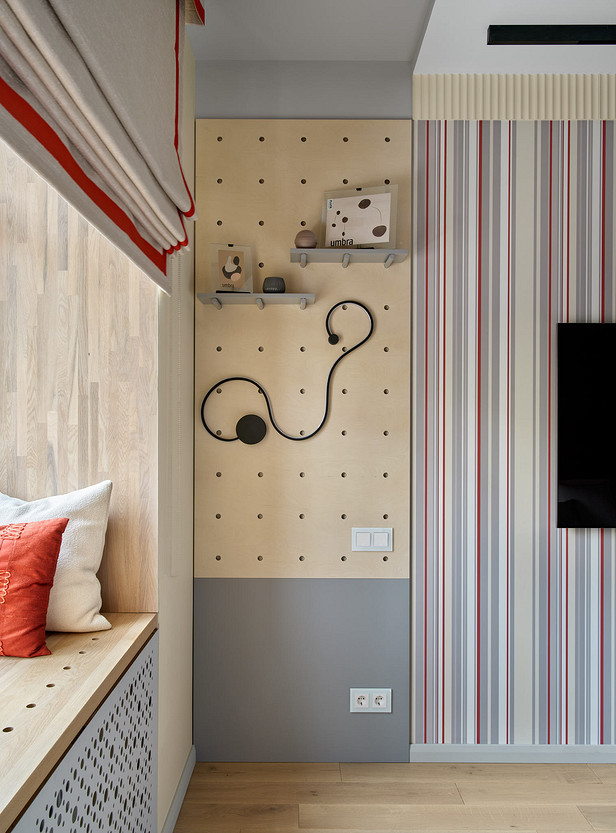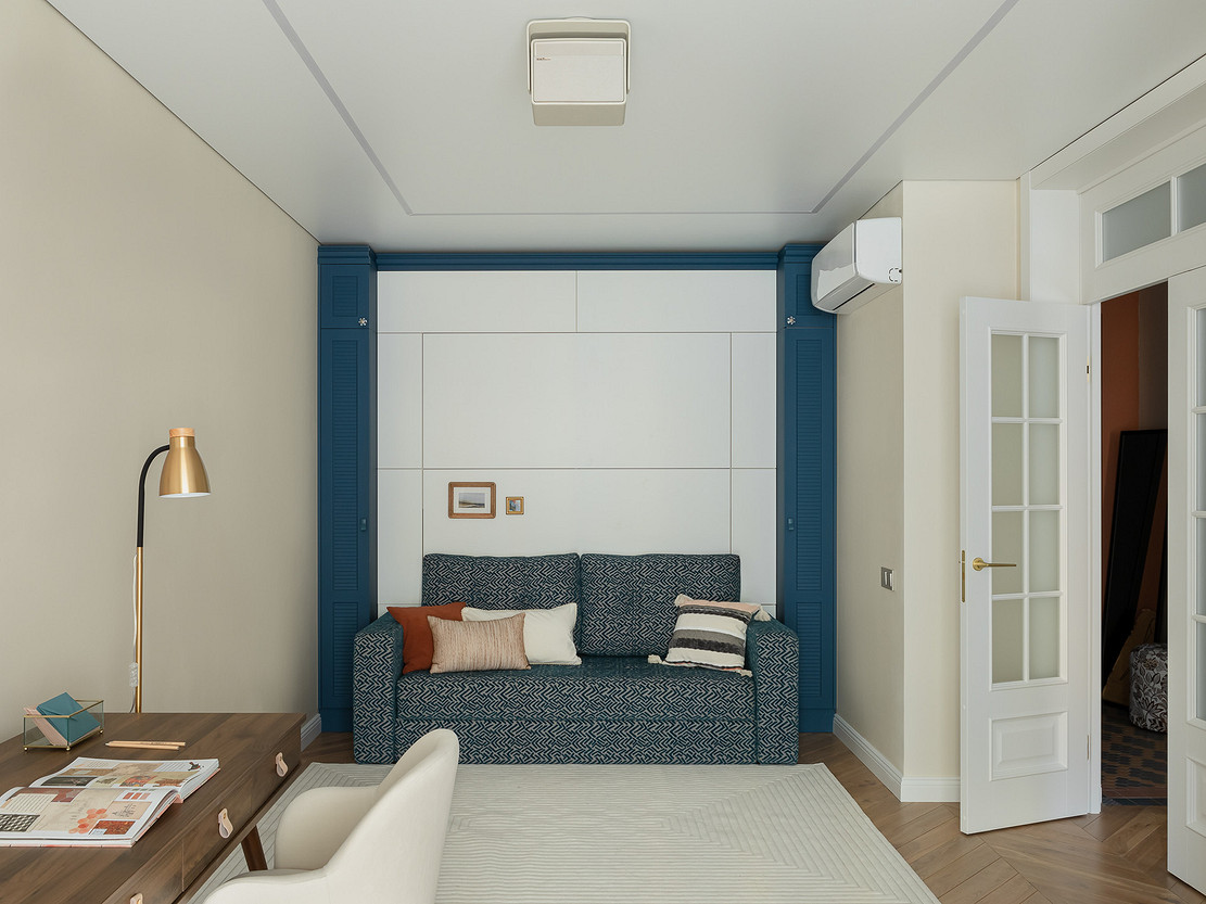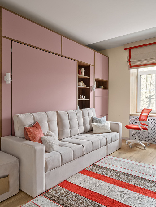 Эта квартира принадлежит семье с дочерью-подростком. В комнате для девочки дизайнер Анастасия Уфимцева предложила использовать мебель-трансформер — кровать-диван-шкаф. Такое решение стало отличным компромиссом — у девочки есть полноценное спальное место, но днем она может пригласить в гости подруг и посадить их на диван, а не на кровать. К тому же в узкой комнате так удалось сэкономить пространство.