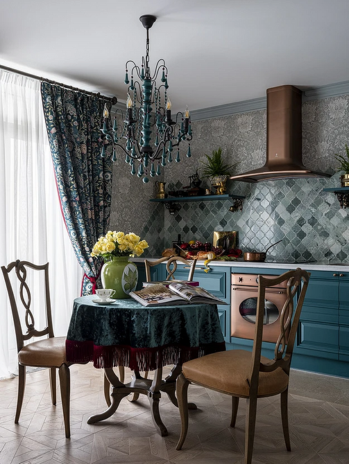 Визуально столик может быть нейтральным (например, в цвет гарнитура) или, наоборот, ярким выделяющимся акцентом. Интересная дизайнерская идея — дополнить его стульями из разных комплектов. Это сразу привлекает внимание и смотрится очень оригинально.