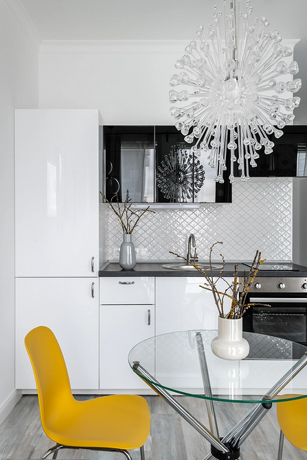 Прозрачная столешница смотрится очень невесомо, поэтому особенно часто такие модели выбирают для маленьких кухонь или студий. Но этот вариант подойдет и для просторной гостиной-столовой, где стеклянная поверхность будет создавать игру света и интересный контраст с другой, более массивной мебелью.