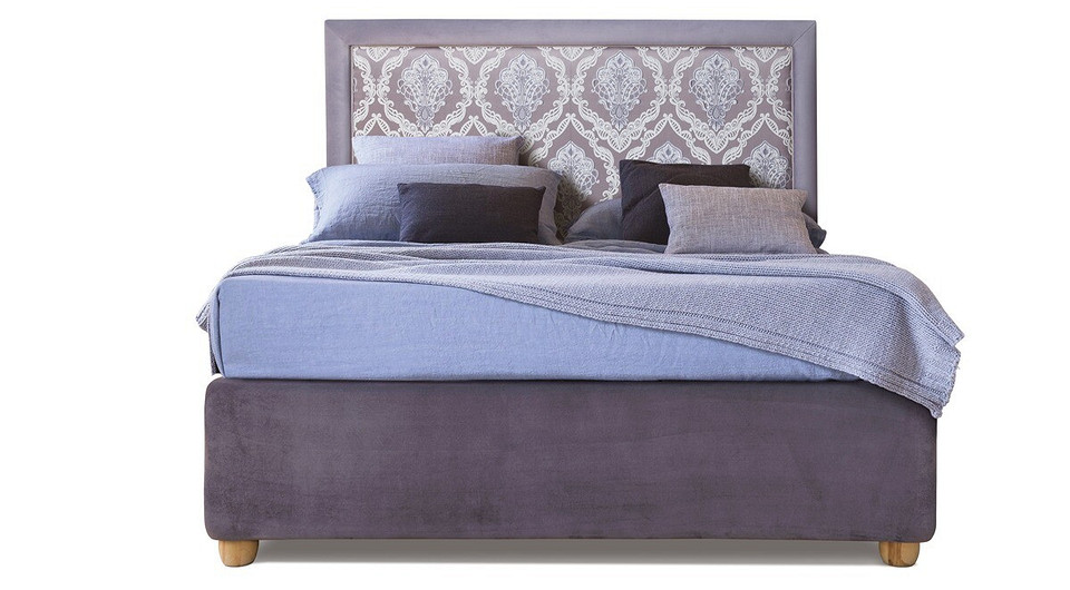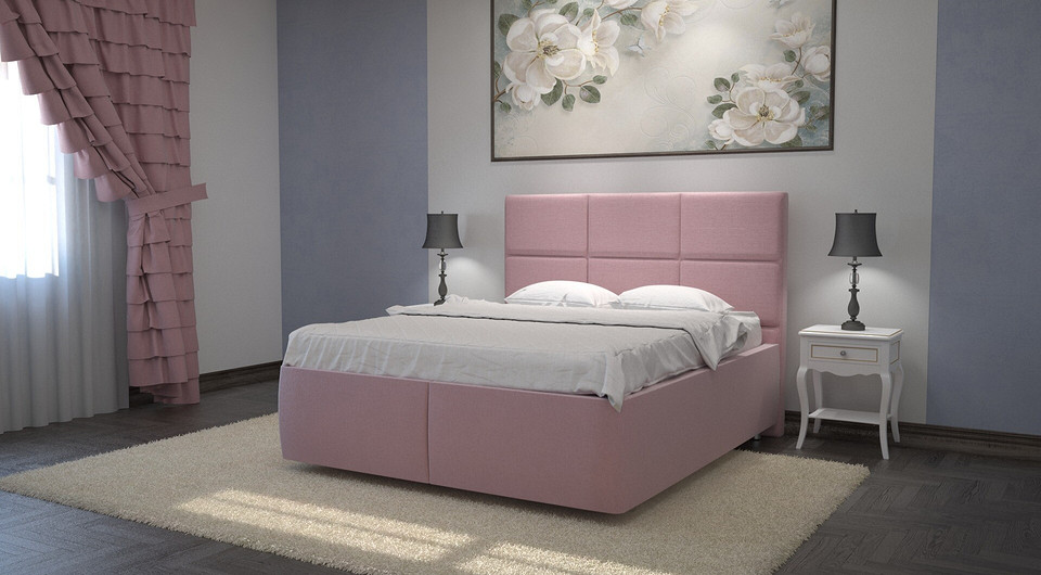 Кровать доступна в обивке нескольких возможных спокойных оттенков. Мягкое высокое изголовье с декором в виде симметричных прямоугольников.