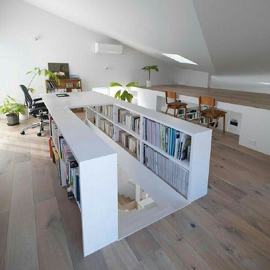 Рабочее место стало во многих домах обязательным составляющим интерьера. Психологически хочется отделить его от спальни, чтобы создать необходимый рабочий настрой. Перегородка здесь служит не только разделителем, но и вместилищем для книг, папок с документами и канцелярии.