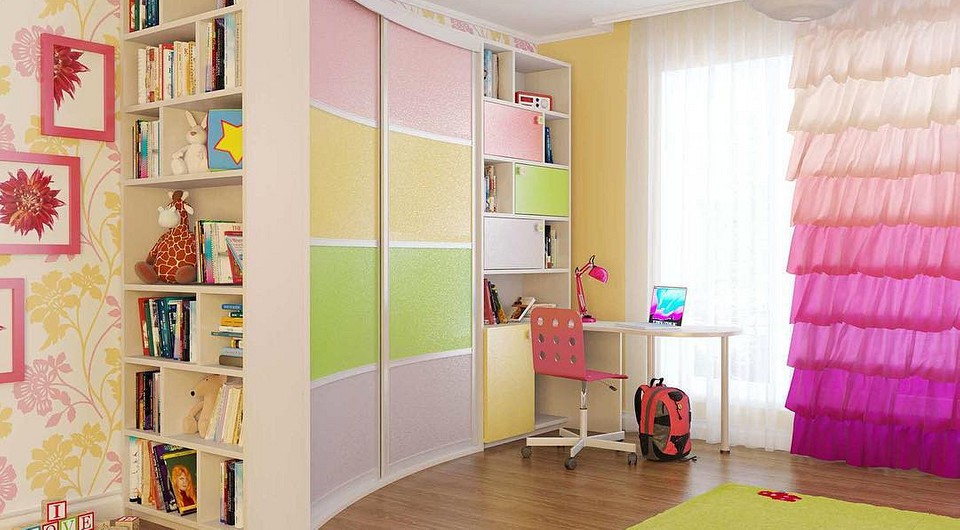 Маленькую детскую можно разделить узкими перегородками с обеих сторон, сделав их в виде открытых полок.