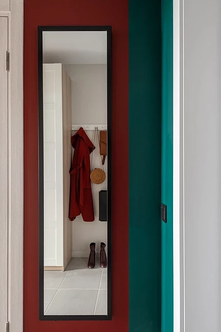 Интересное и неизбитое решение для помещений нестандартной формы — сложное окрашивание. Комбинация разных красок и форм отвлекает внимание от неправильных пропорций, и этот прием отлично подходит для входной зоны. Например, можно использовать колор-блок и взять несколько насыщенных контрастных оттенков. Например, в проекте на фото бордовый и темно-зеленый расположили на двух соседних стенах, причем один из цветов заходит на «территорию» второго. Такая яркая отделка притягивает взгляд и немного корректирует форму прихожей.
