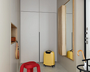 Этот проект для семьи с маленьким ребенком изначально задумывался как «тихая гавань», но в итоге он наполнился яркими акцентами. Они есть во всех комнатах, включая прихожую. Почти все хранение во входной зоне сделали закрытым, организовав встроенные шкафы для сезонной одежды, обуви и хозяйственных принадлежностей. Цветовых акцента два: деревянные элементы (зеркало, полки) и яркий красный пуф, который привлекает внимание не только смелым акцентом, но и интересной формой.