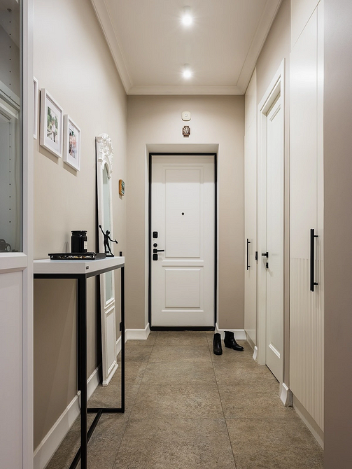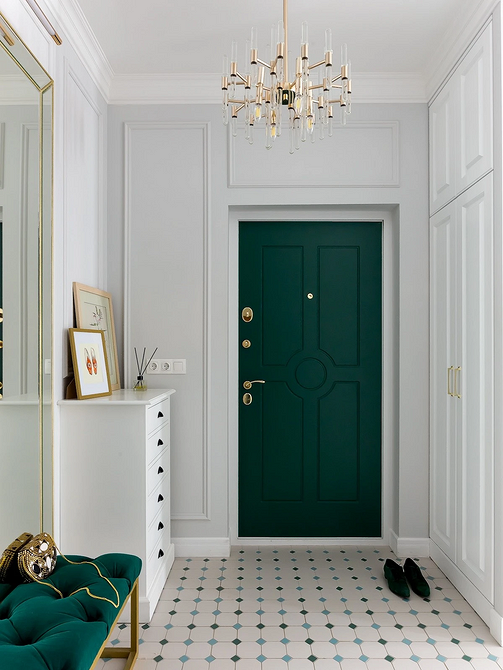 Площадь этой прихожей — меньше 3 квадратов, но дизайнеру удалось создать красивое и при этом функциональное пространство. Интерьер выполнен в стиле неоклассика — так же, как и вся квартира. Справа от двери установили встроенный шкаф в тон отделке, часть фасадов — зеркальная. За счет отражения маленькая входная зона кажется визуально больше. Напротив хватило места для узкой, но вместительной закрытой обувницы и яркого акцентного пуфа.