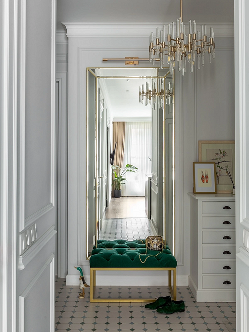 Эта квартира выполнена в неоклассическом стиле, и прихожая поддерживает концепцию. За счет большого количества золотых деталей, четких геометрических форм и контрастной палитры можно сказать, что здесь присутствуют и элементы ар-деко — конечно, в актуальном прочтении. При этом входная зона еще и очень удобная: есть основное закрытое хранение, а справа от двери — вместительный комод-обувница, сверху на который можно класть нужные мелочи. За ним — зона для сборов с большим зеркалом и пуфиком, на который удобно присесть или бросить сумку.