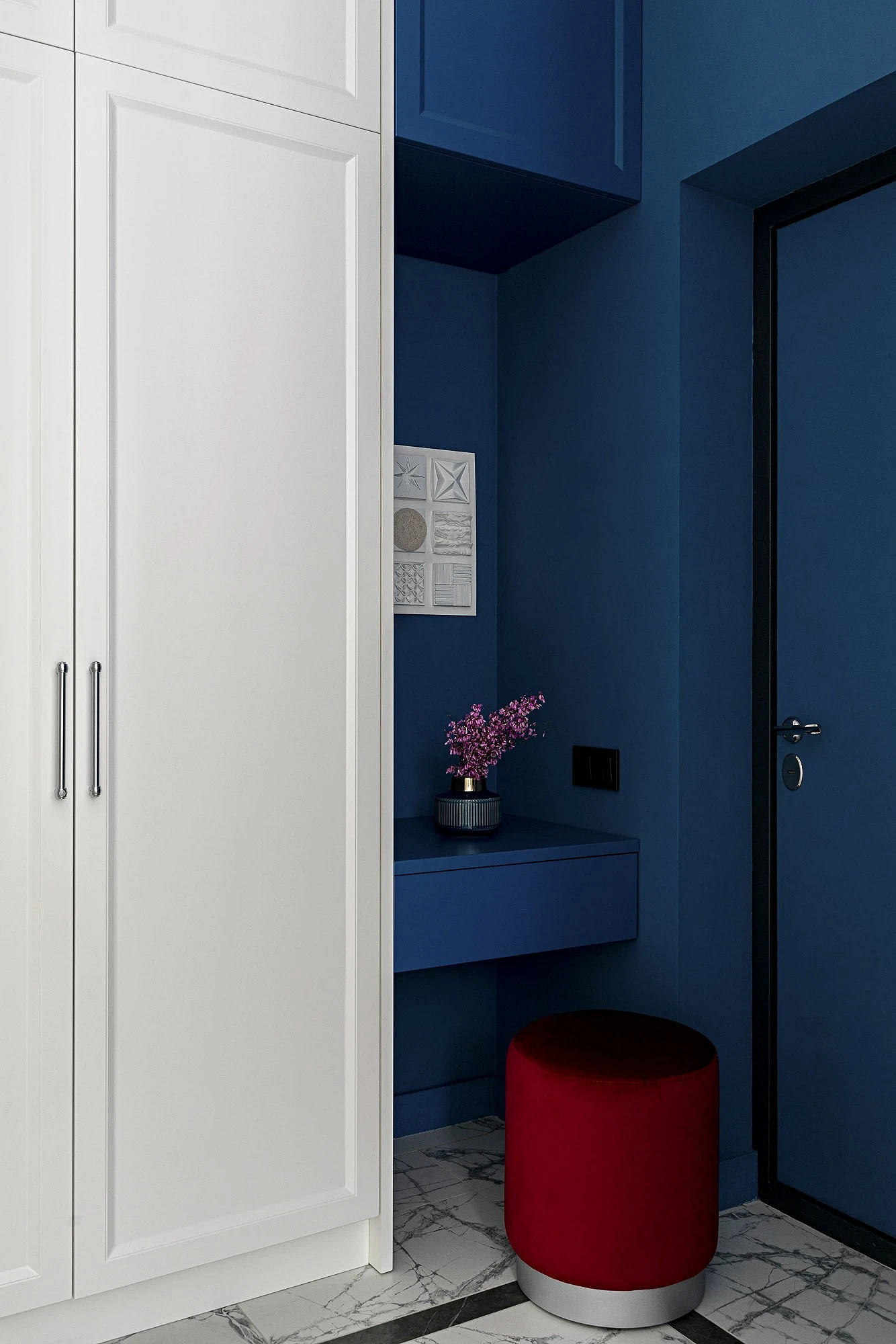 Прихожая в этой квартире — яркий пример удачного зонирования цветом. Помещение площадью чуть больше 7 квадратов визуально разделили на две части: входная группа, выкрашенная в глубокий синий оттенок, и светлая зона хранения со встроенным шкафом и обувницей. Контрастное окрашивание не только зонирует прихожую, но и создает эффект шкатулки, когда из темного пространства мы попадаем в светлое. За счет этого комната в целом кажется просторнее. А еще здесь вообще нет визуального шума за счет закрытых систем хранения и минимального количества декора.