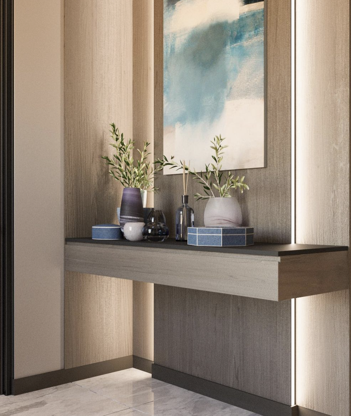 В этом проекте совместили заботу о домашнем питомце и создание яркого впечатления при входе в квартиру. Крупная конструкция для кота привлекает внимание и хорошо вписывается в интерьер в нейтральных оттенках бежевого, коричневого и серого. А заодно отвлекает питомца от других поверхностей, об которые можно точить когти.