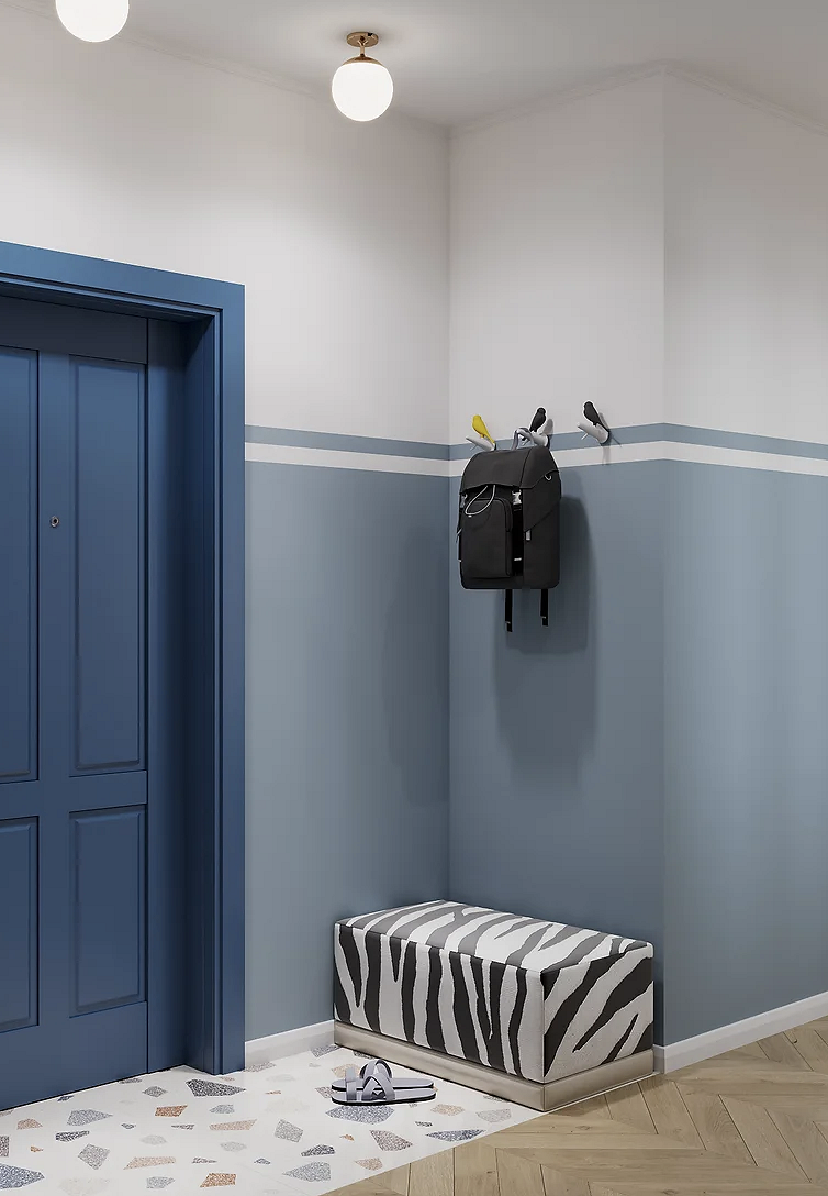 Еще один прием, который поможет сделать прихожую и коридор интереснее, — цветовое зонирование. Оно помогает выделить часть пространства и акцентировать на нем внимание. В этом примере дизайнер использовала насыщенный синий, так как после коридора начинается светлая часть в легких и нейтральных оттенках. У цвета есть четкая граница, он весь сконцентрирован в зоне входной двери. Чтобы интерьер квартиры не выглядел разрозненно из-за резких переходов между цветами, использовали синий плинтус, который идет по всему коридору.