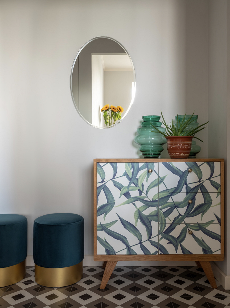 Коридор и прихожая обычно занимают небольшую площадь, и интуитивно мы стараемся подбирать мелкий декор, чтобы не занять слишком много места. Но в этом интерьере учли особенность всех маленьких пространств: в них отлично вписывается один крупный аксессуар — напольная картина. Синий цвет на холсте перекликается с акцентными пуфами у входной двери, а на дверцы обувницы нанесли самоклеящуюся пленку с растительным узором, чтобы мебель тоже выглядела декоративно и оживляла пространство.