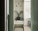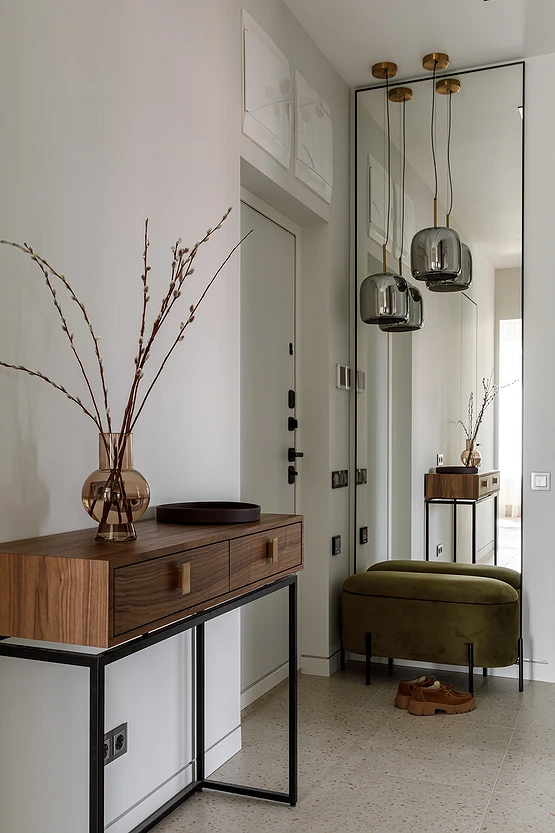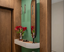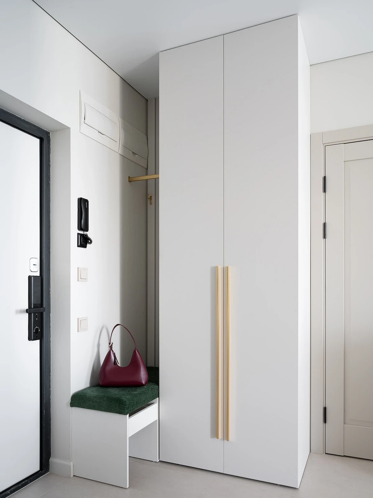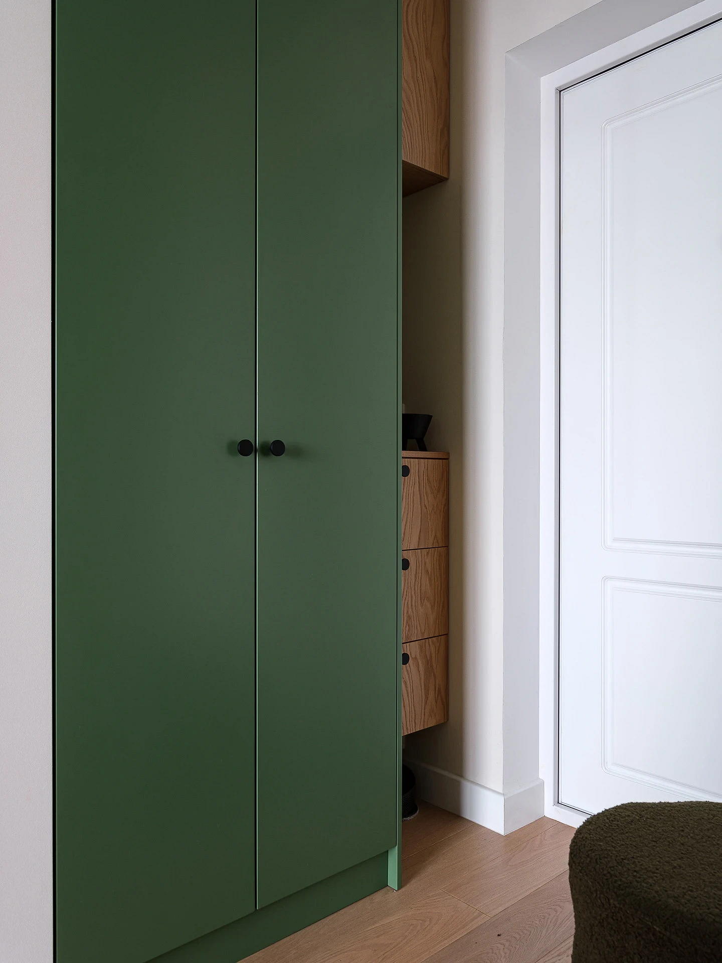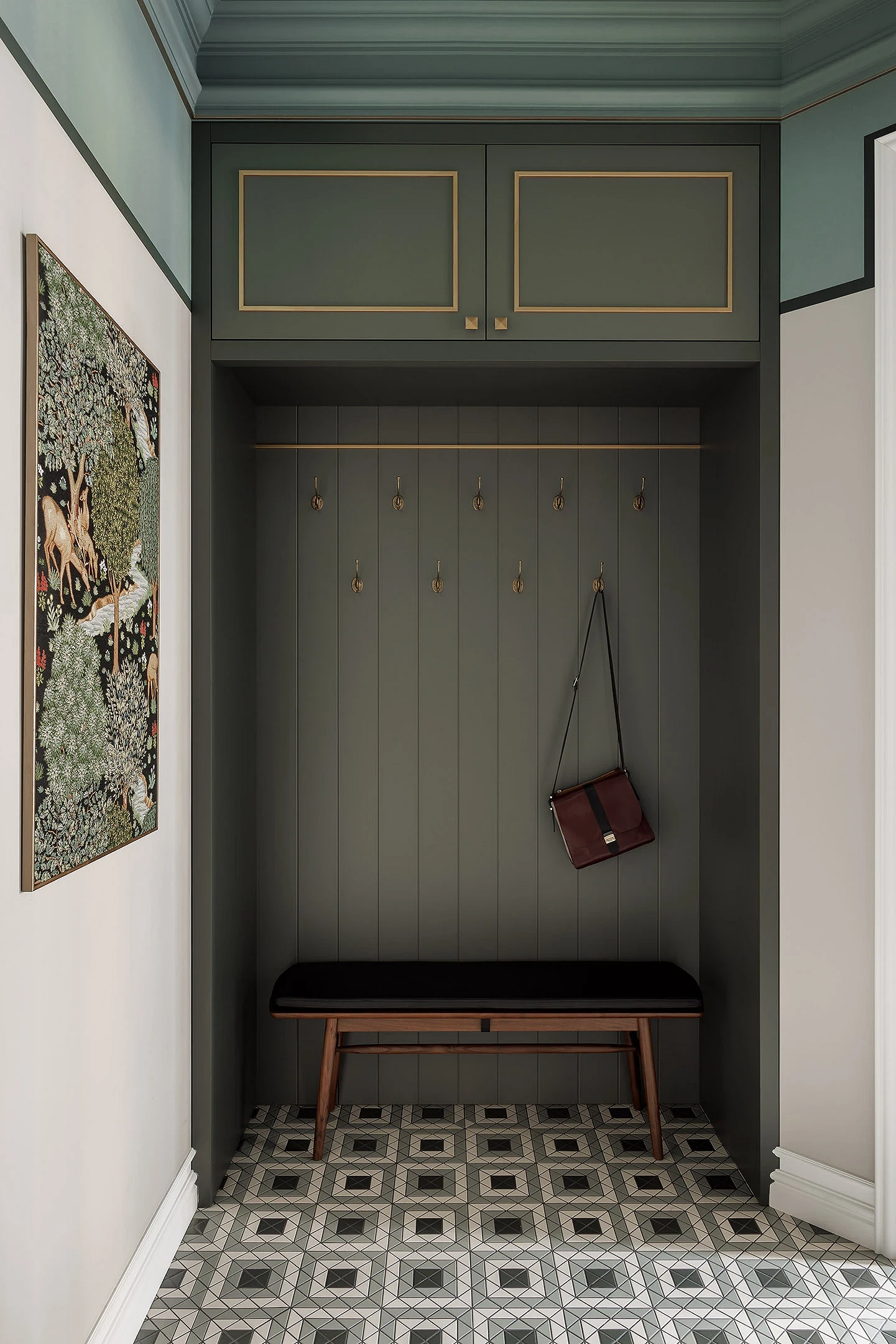 Матовая зелень гармонично сочетается с деревянными мебелью и отделкой, бежевыми и серыми тонами. Если хочется создать контраст, добавьте латунные или позолоченные детали. В маленькой входной зоне зеленый лучше использовать точечно: например, для одного предмета мебели, декора или отделки ниши.