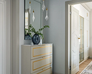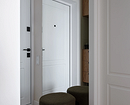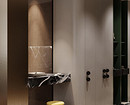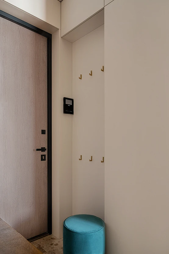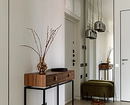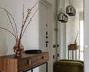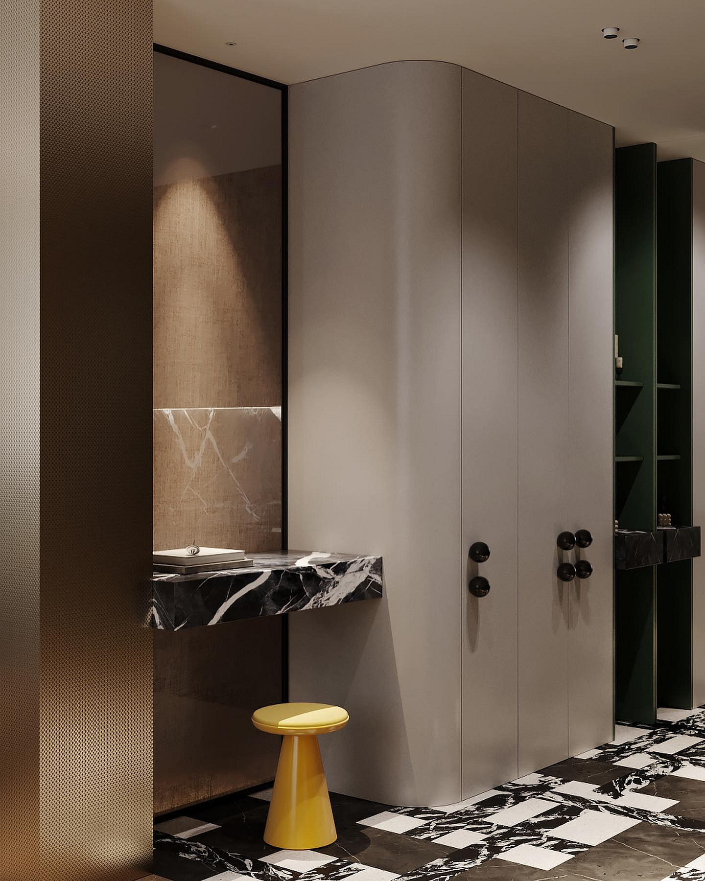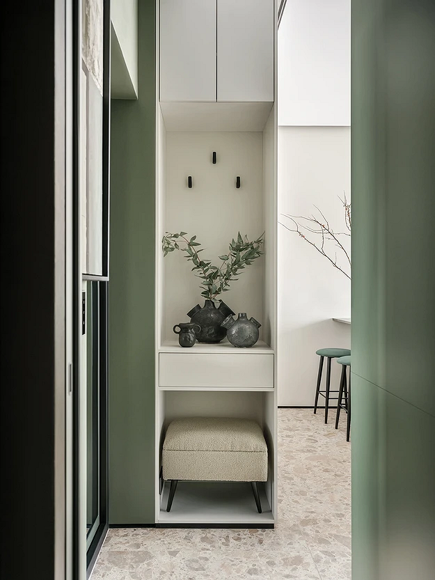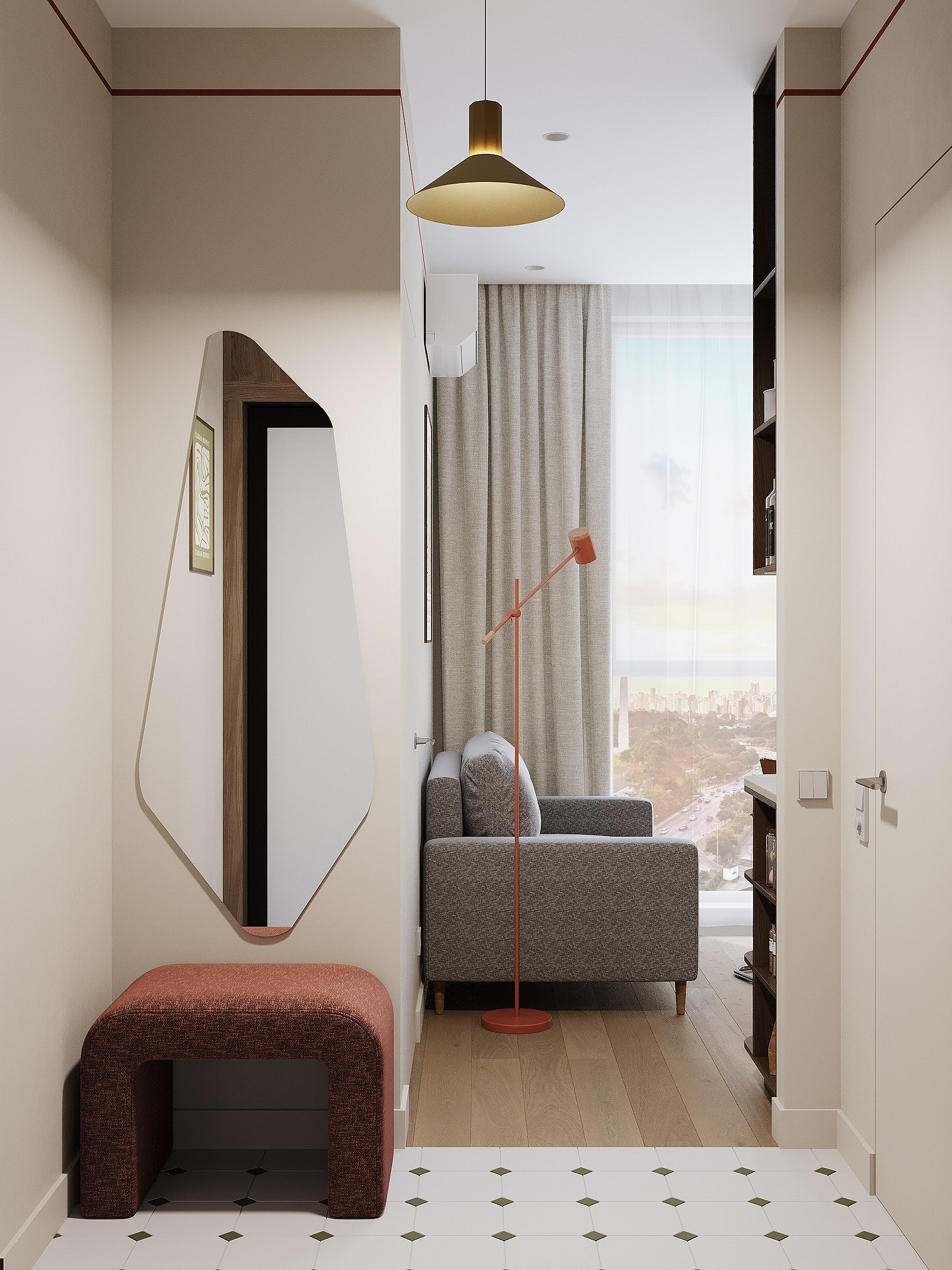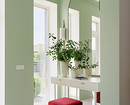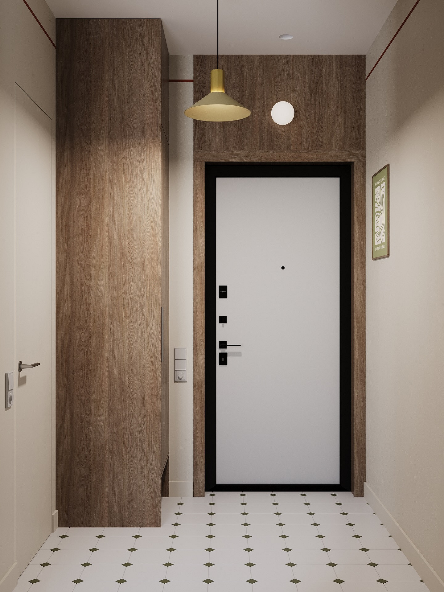 Матовая зелень гармонично сочетается с деревянными мебелью и отделкой, бежевыми и серыми тонами. Если хочется создать контраст, добавьте латунные или позолоченные детали. В маленькой входной зоне зеленый лучше использовать точечно: например, для одного предмета мебели, декора или отделки ниши.