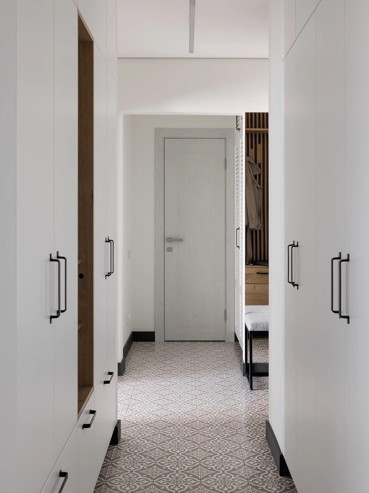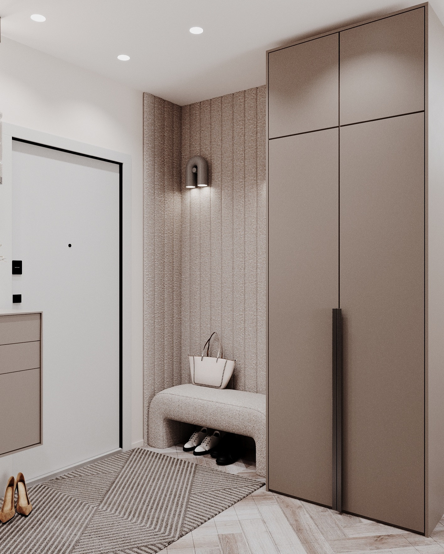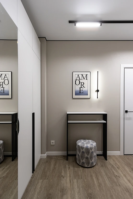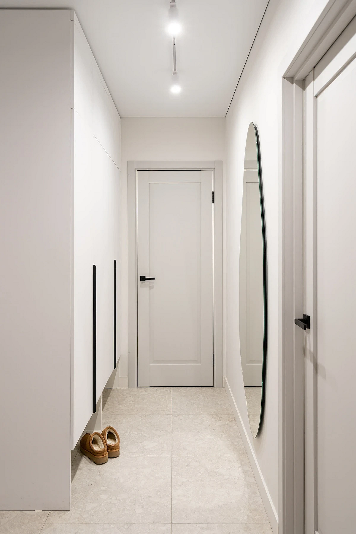 Одно из характерных для минимализма решений — отказ от традиционного шкафа в пользу компактной гардеробной, примыкающей к входной зоне. Это позволяет разгрузить пространство, избежать нагромождения сезонных вещей и постоянного беспорядка. Если все-таки хочется сделать шкаф, отдавайте предпочтение встроенным системам с фасадами в тон отделке.