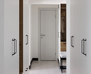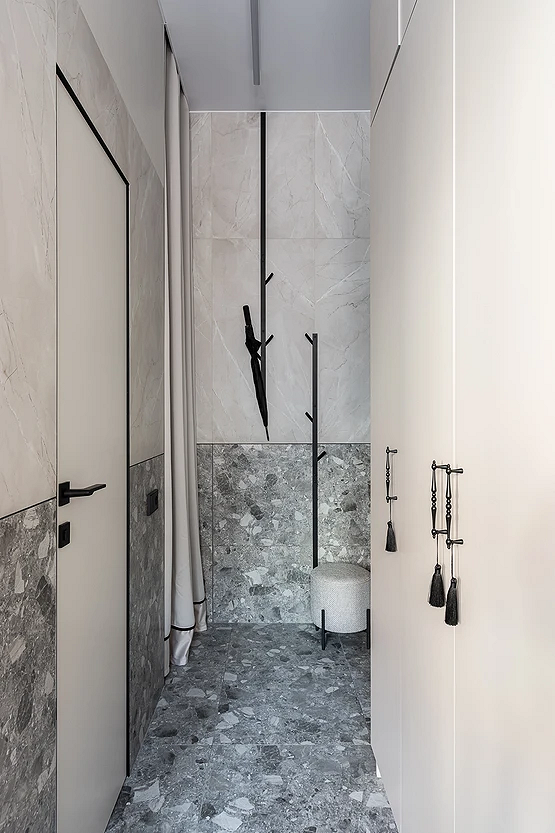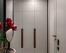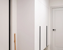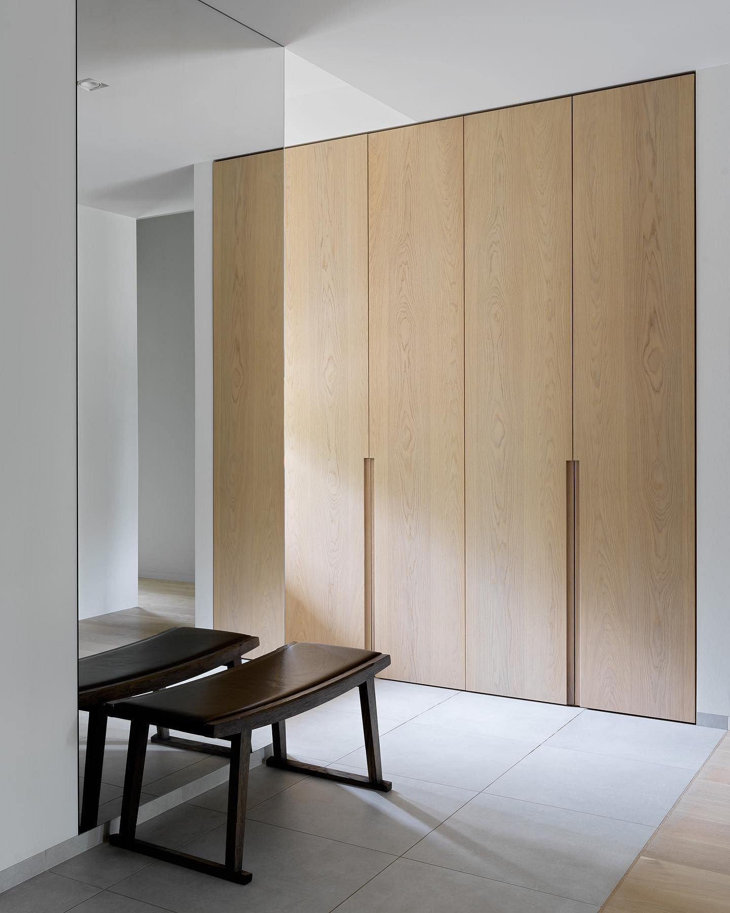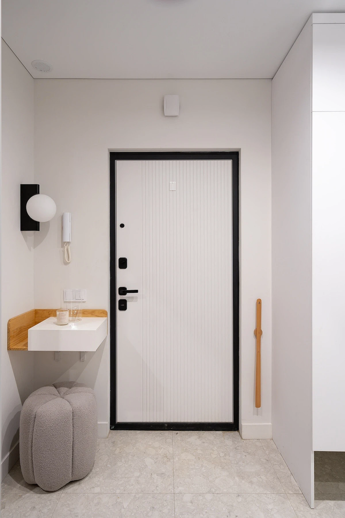 Одно из характерных для минимализма решений — отказ от традиционного шкафа в пользу компактной гардеробной, примыкающей к входной зоне. Это позволяет разгрузить пространство, избежать нагромождения сезонных вещей и постоянного беспорядка. Если все-таки хочется сделать шкаф, отдавайте предпочтение встроенным системам с фасадами в тон отделке.