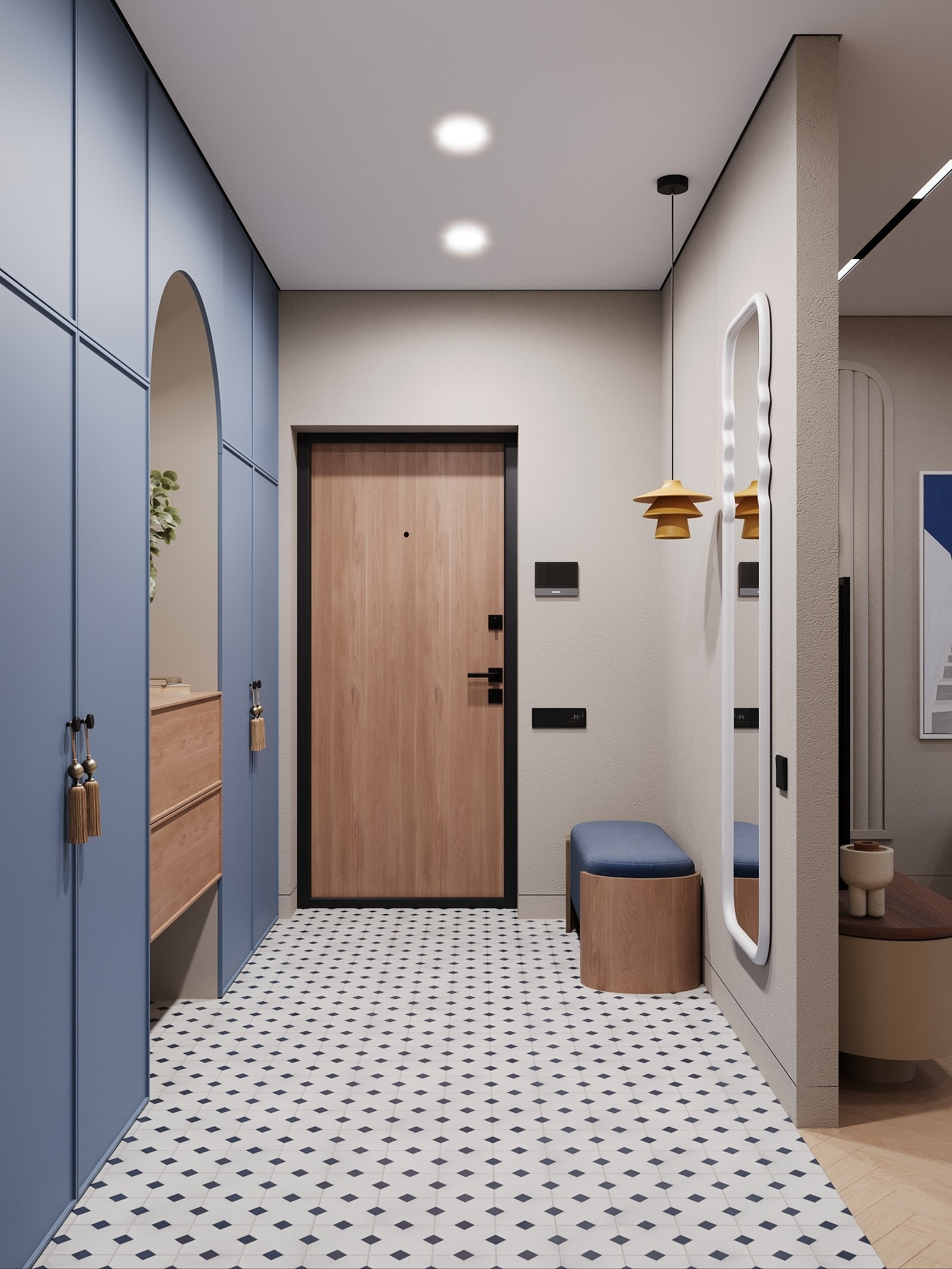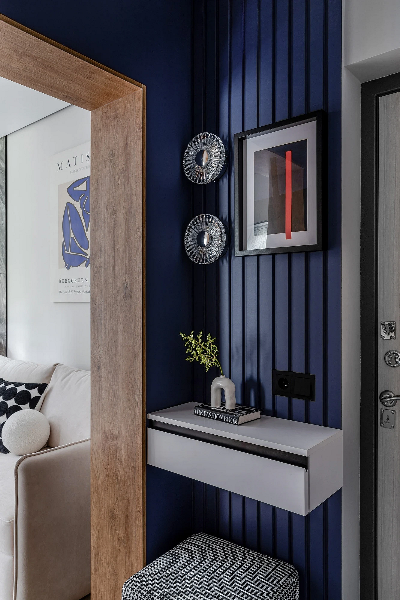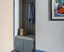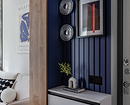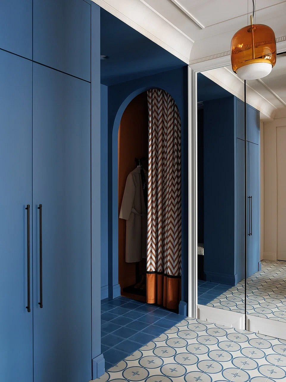 В интерьере прихожей синий лучше всего комбинировать с натуральными материалами и неброскими светлыми оттенками. Универсальные цвета-компаньоны — молочно-белый, оттенки бежевого и коричневого. Они уравновешивают холодность синего и голубого, не вызывают хандру.