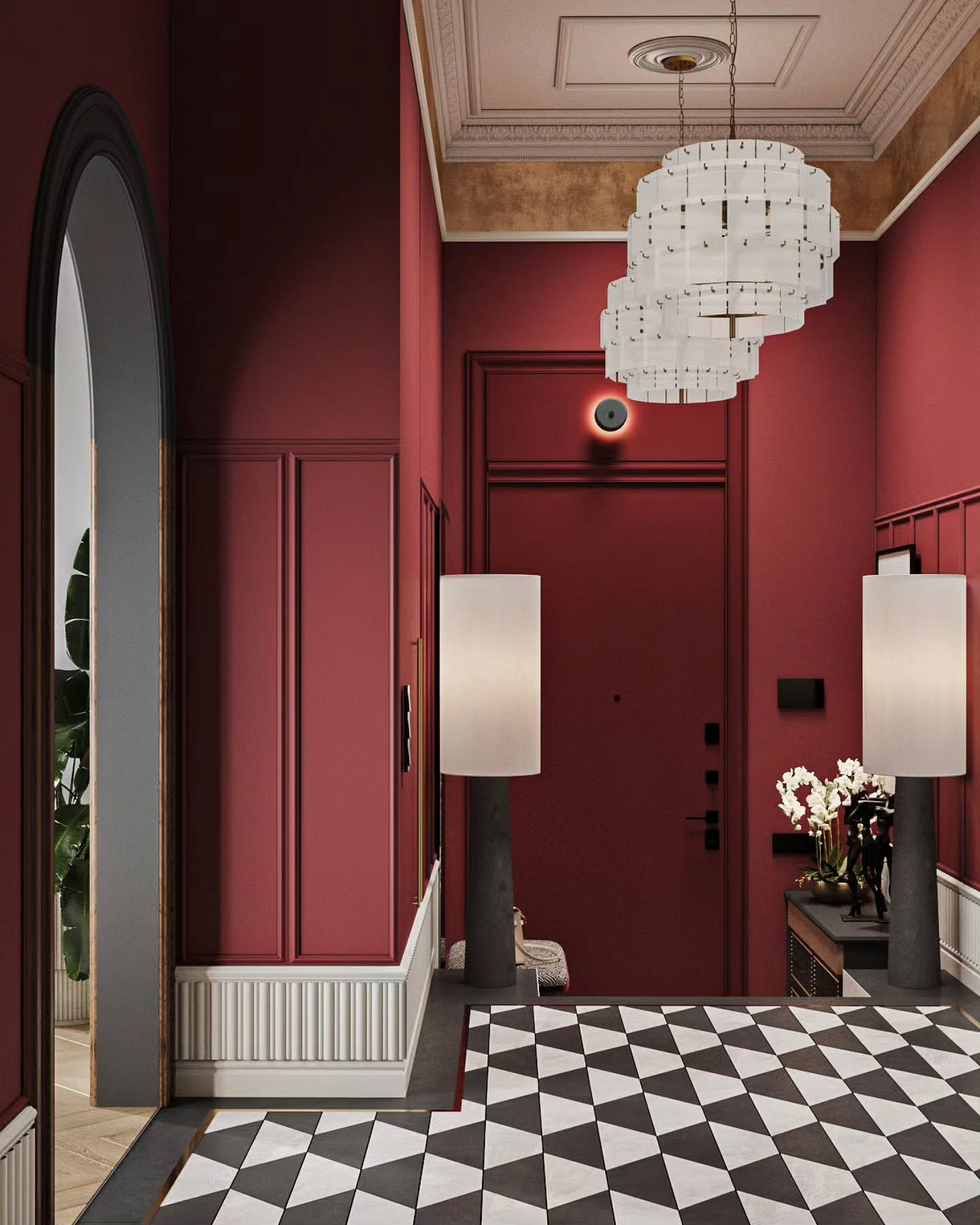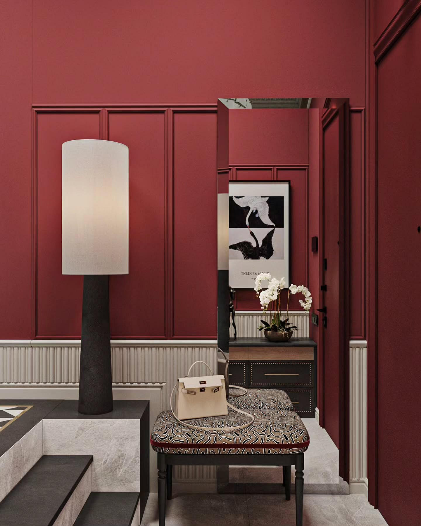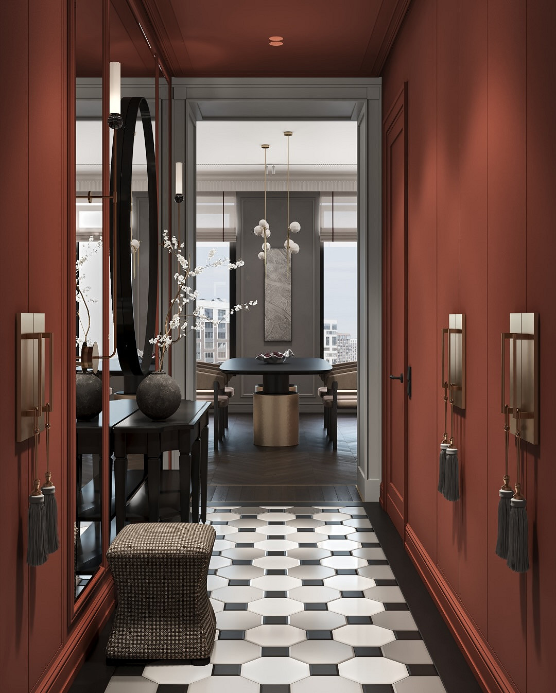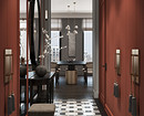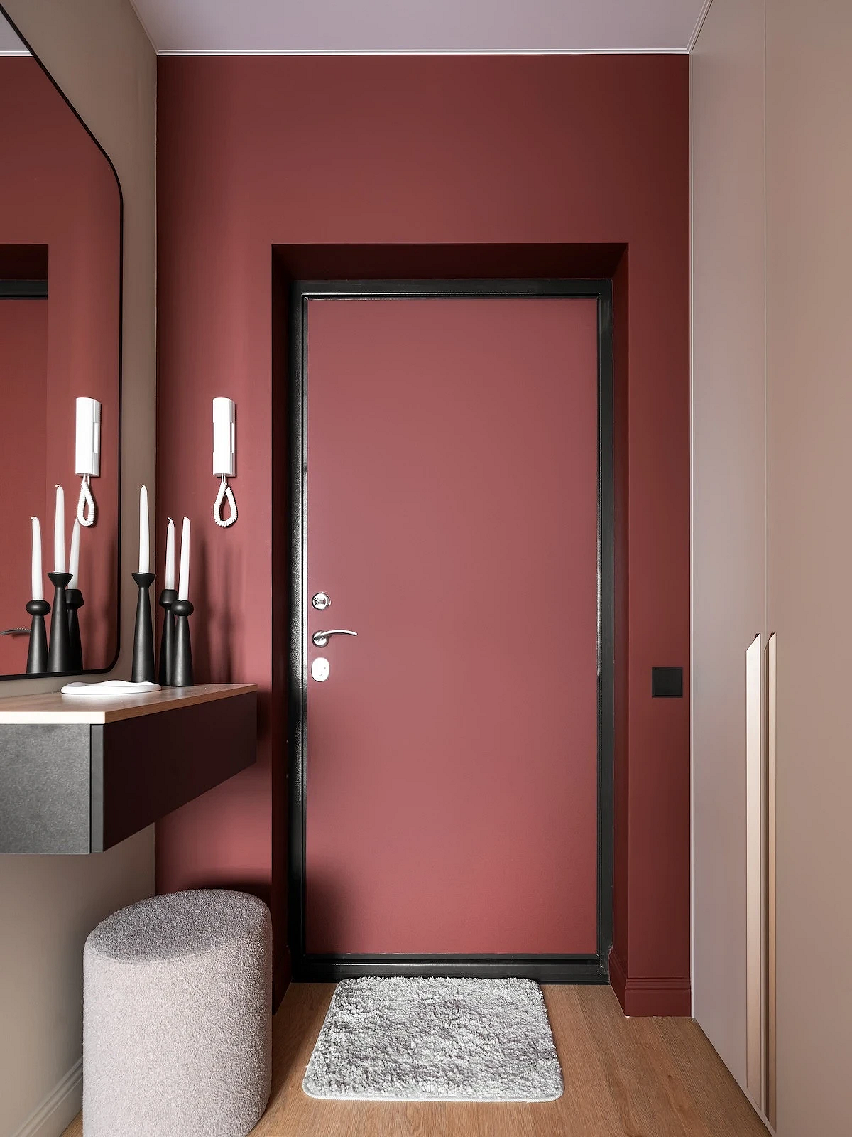 Глубокие оттенки красного становятся заметным цветовым акцентом в дизайне прихожей. Дизайнеры предлагают использовать бургунди, винный, кирпичный и другие сложные темные оттенки. Они смотрятся эффектно, но не агрессивно. Лучшие всего раскрываются в роли акцентов: от штучного декора до частичного окрашивания стены.