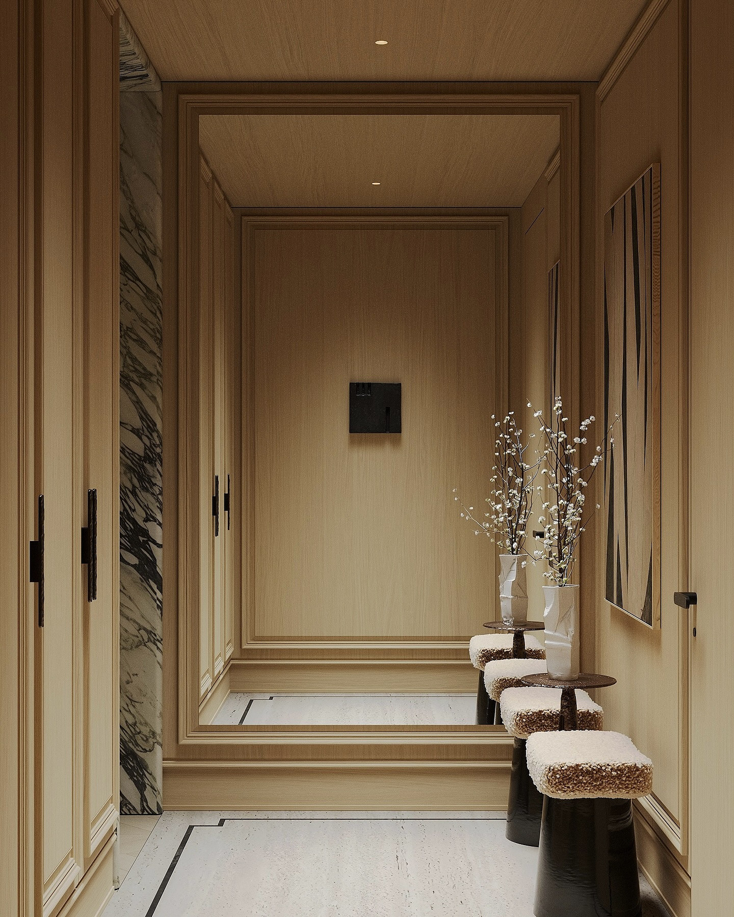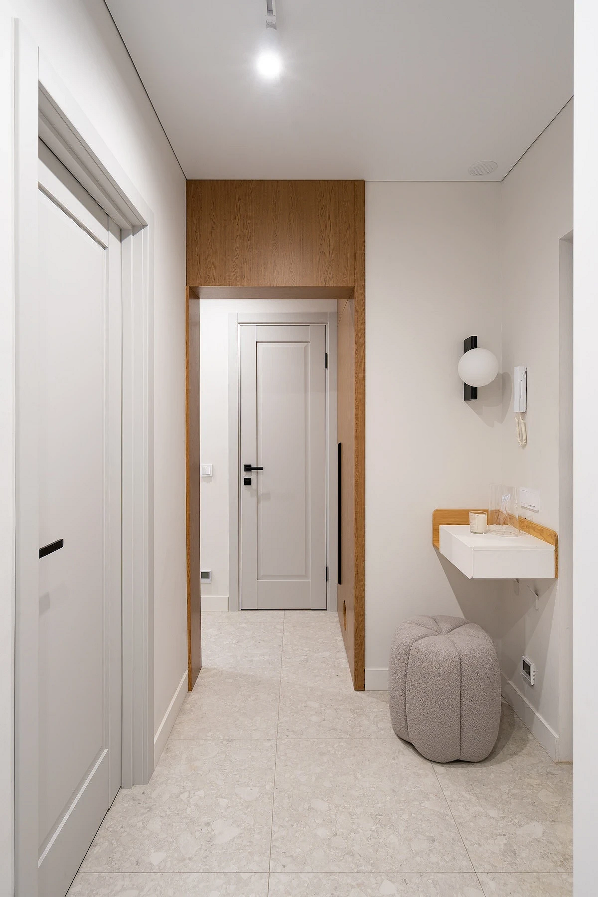 Спокойные натуральные оттенки остаются востребованной базой. Они добавляют уюта и зрительно расширяют пространство, наполняют его воздухом. Планируя дизайн интерьера прихожей с длинным коридором в 2026-м,
