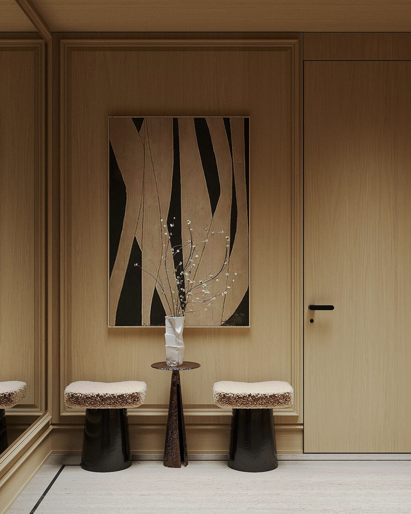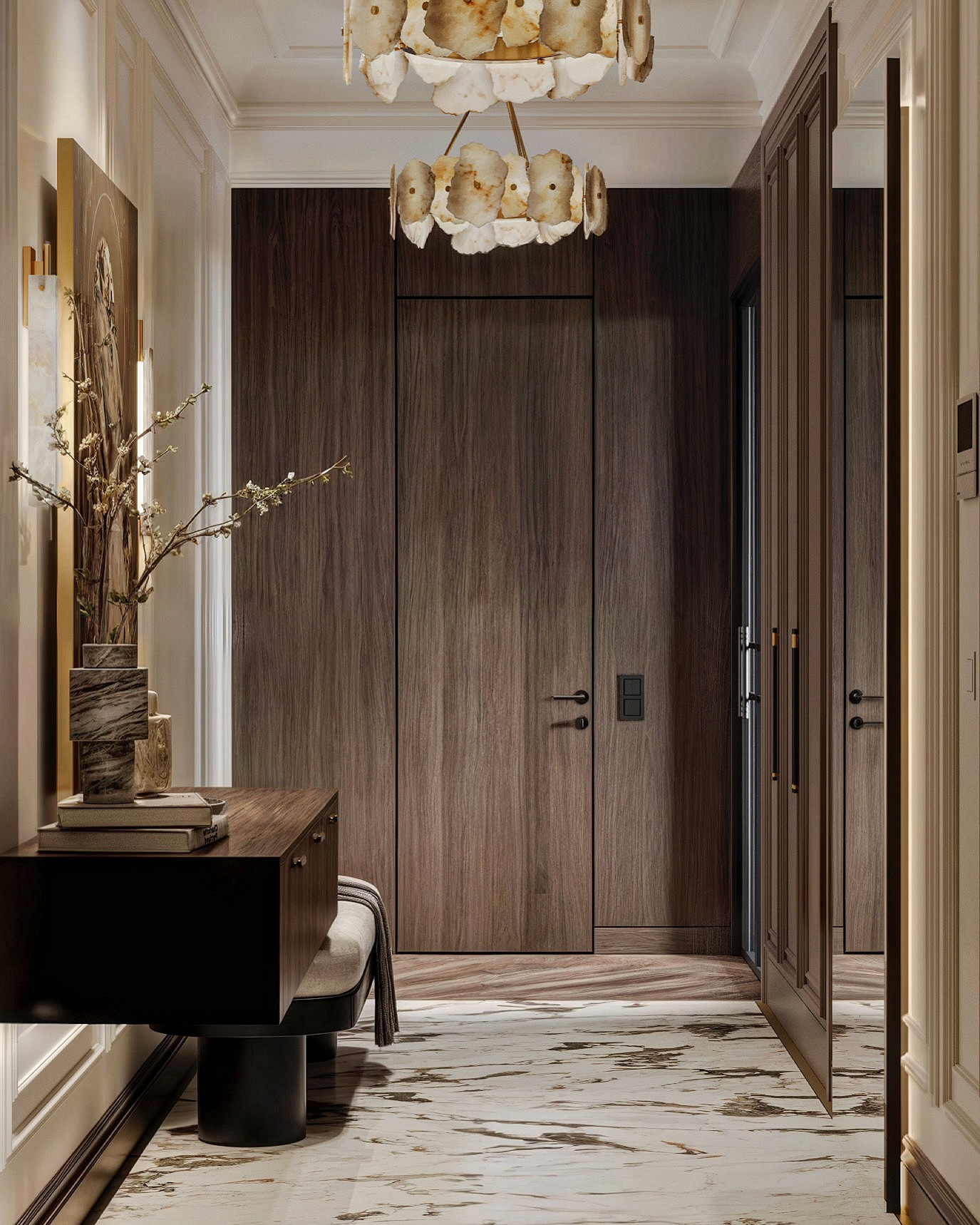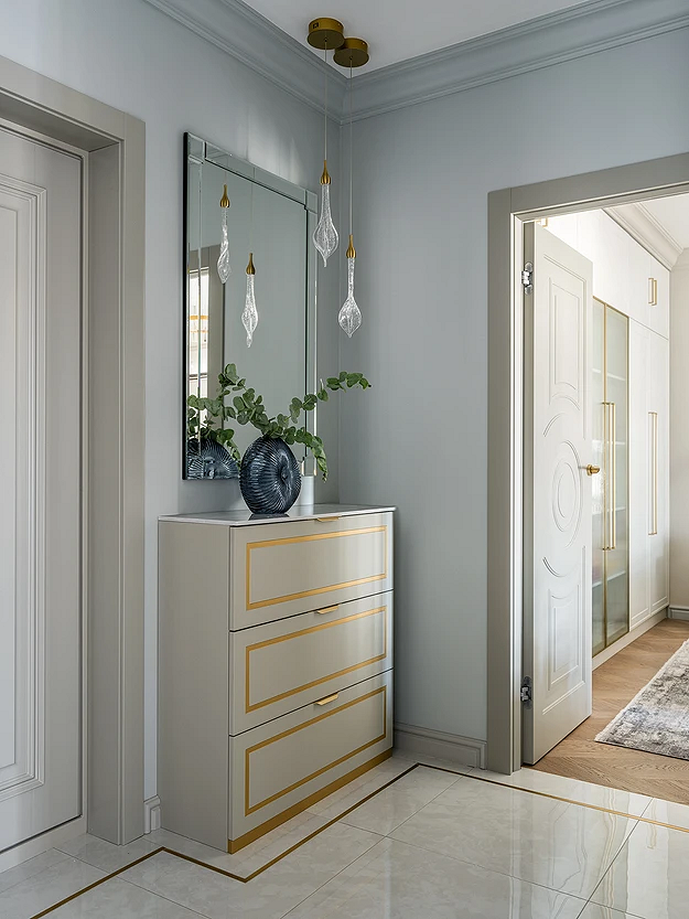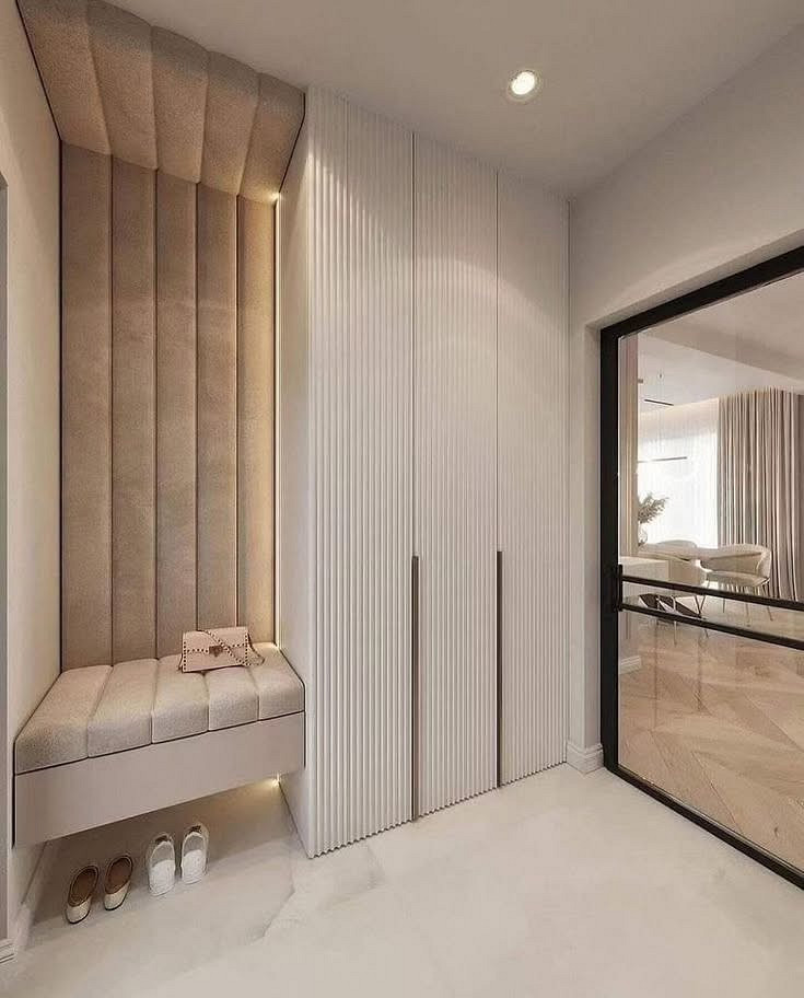 Обратите внимание на мягкие банкетки, диванчики и компактные сиденья с секциями для хранения. Это практичное решение для небольших входных зон, где важно совместить функциональность и эстетику. Часто их выполняют в одном стиле с панелями или другой мебелью, в том числе делают одну систему на заказ. Благодаря этому интерьер прихожей выглядит цельно и аккуратно, особенно такой подход актуален для классических направлений.