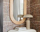 Натуральные оттенки хорошо сочетаются с деревом, керамогранитом под камень, темной или медной фурнитурой. Если опасаетесь, что прихожая получится темной, используйте принцип 60/30/10, где природный оттенок занимает основную площадь стен, а светлые потолки, плинтусы и, например, наличники выступают освежающим контрастом.
