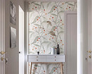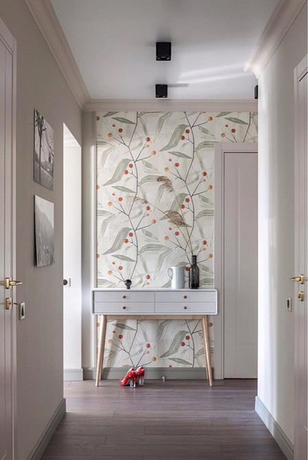 Независимо от размера рисунка на первый план выходит не цвет, а изящество линий: орнамент часто напоминает эскиз тушью или карандашный набросок на бумаге. Такие обои не доминируют в интерьере прихожей, а лишь добавляют ему изюминку и подчеркивают природную тему.