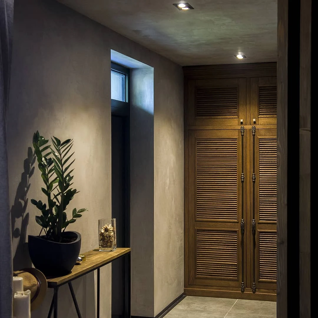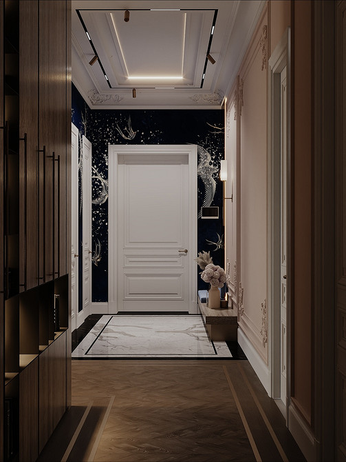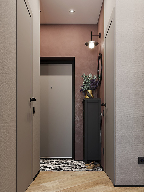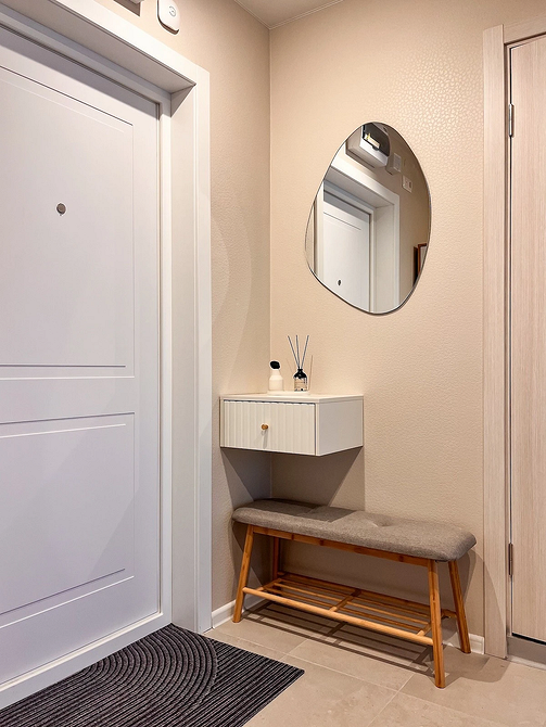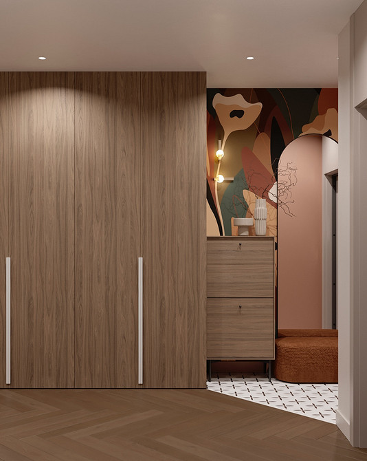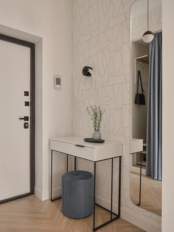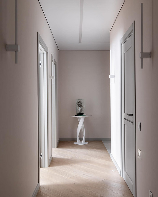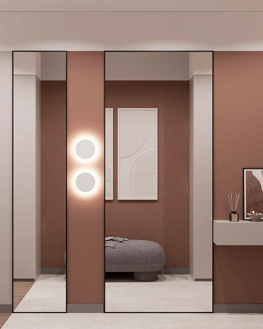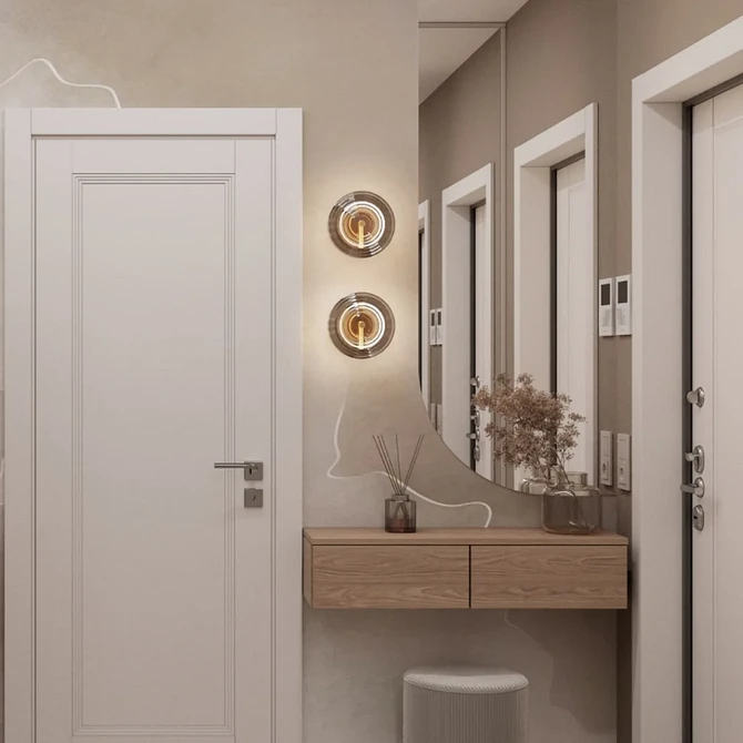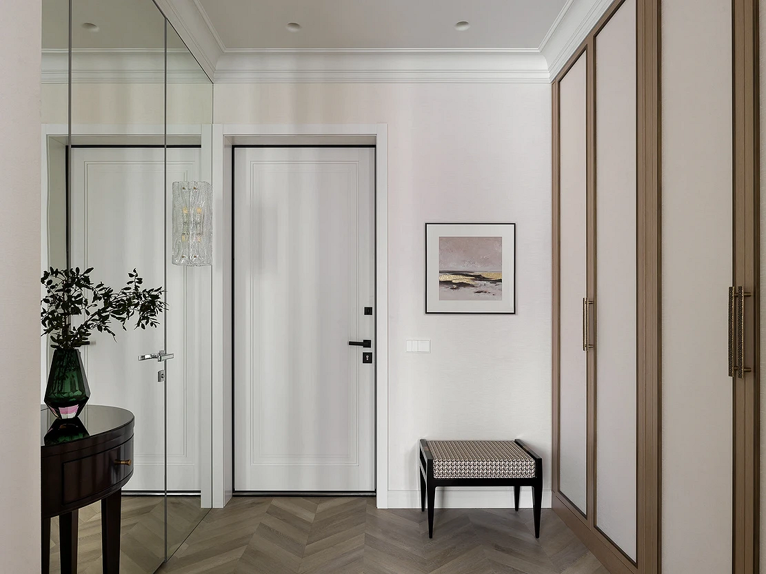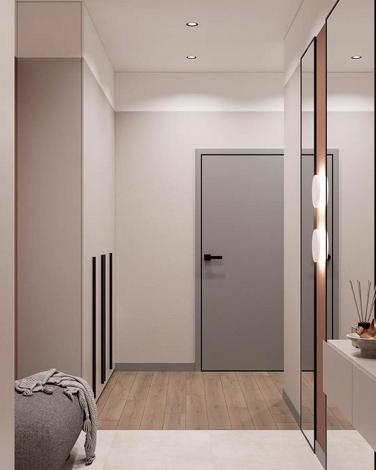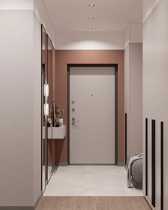 На смену простым нейтральным оттенкам приходят их более сложные вариации, такие как грейдж — гибрид серого и бежевого. Это «умный» цвет, который подстраивается под освещение: он может казаться освежающим, уютным, согревающим. Также актуальны вариации топленого молока, слоновой кости и пудрового белого с едва уловимым розовым подтоном. Такая база визуально расширяет границы даже самой тесной прихожей, делает ее более воздушной.