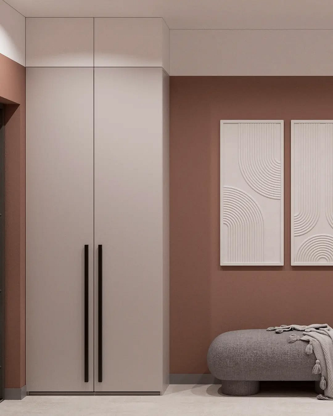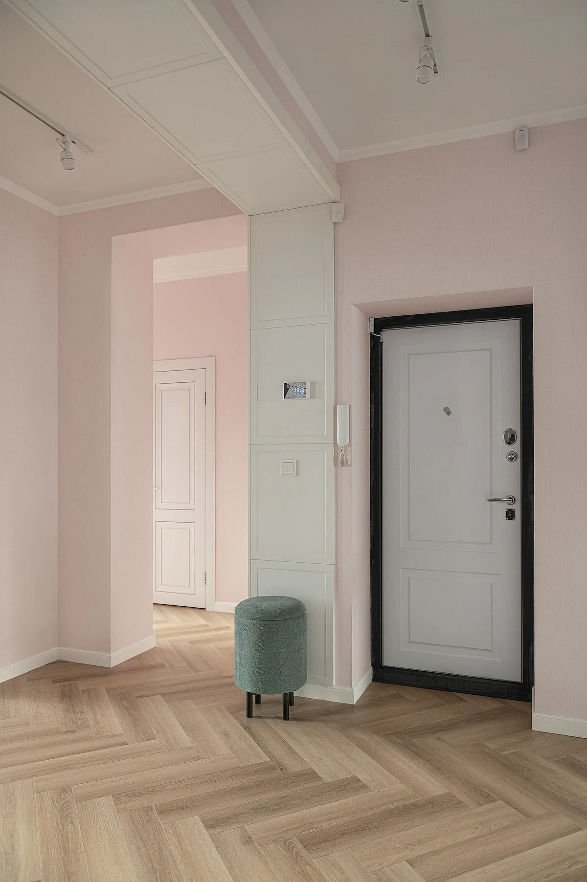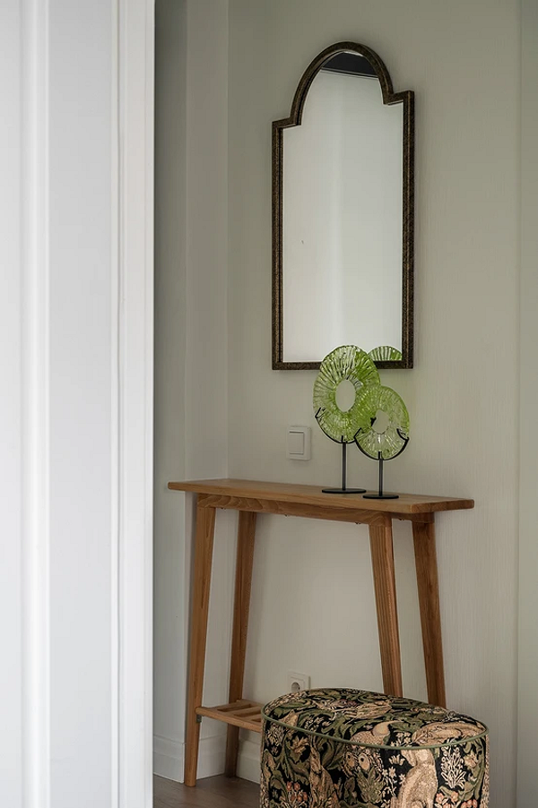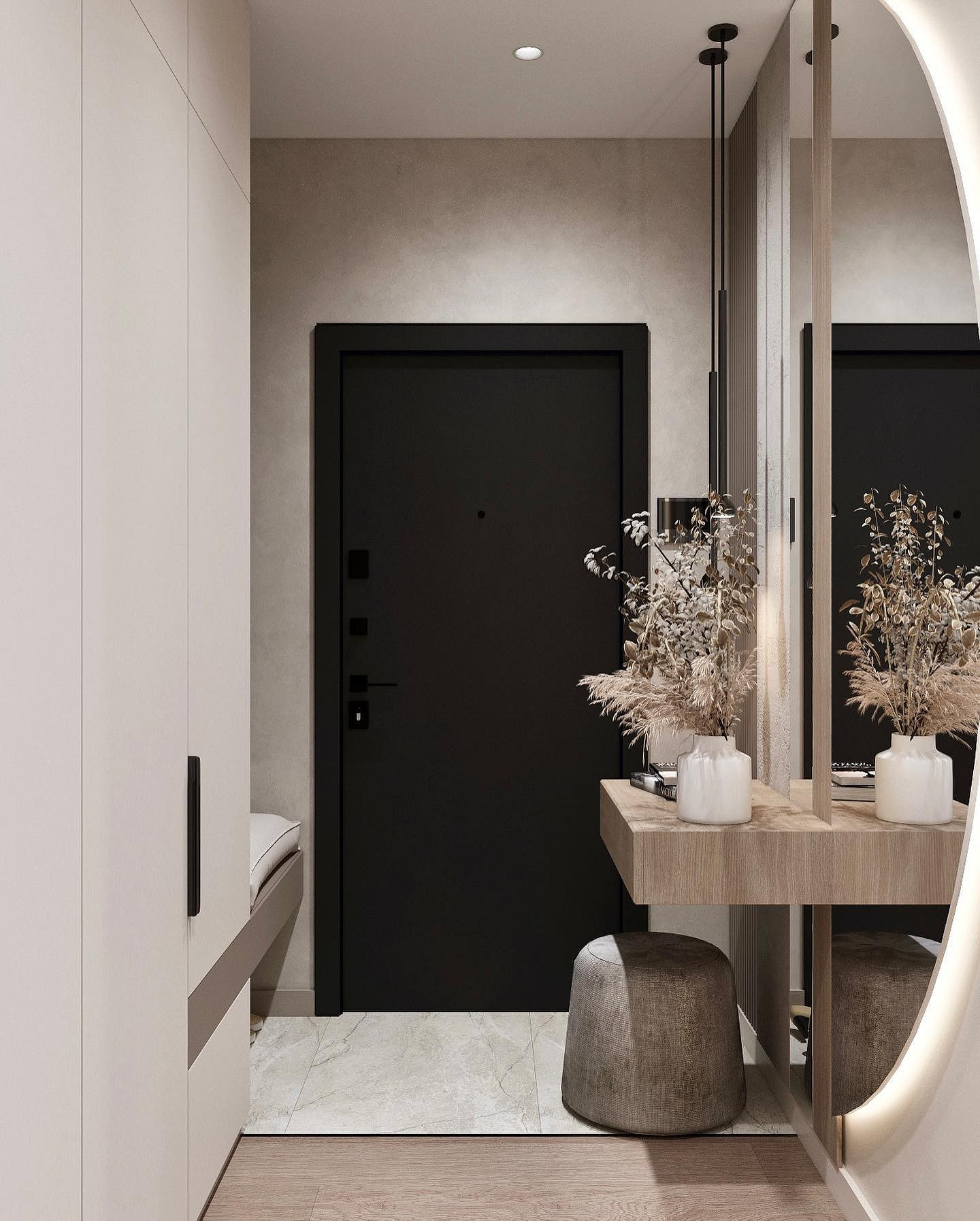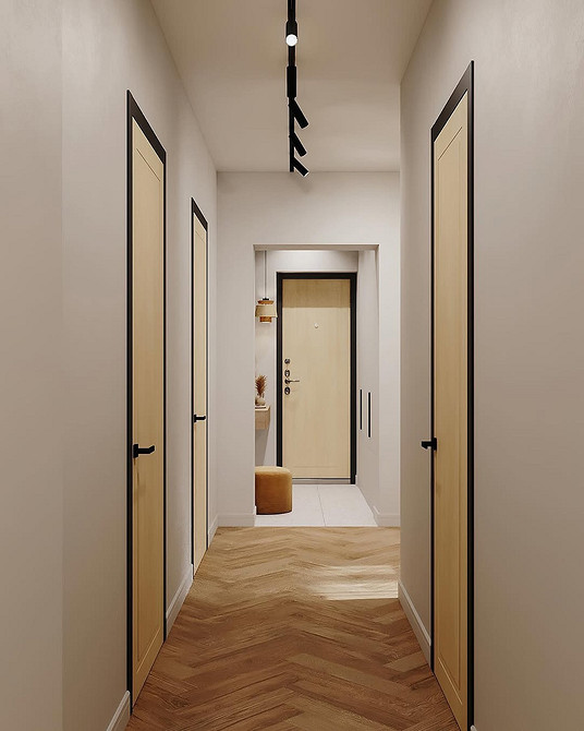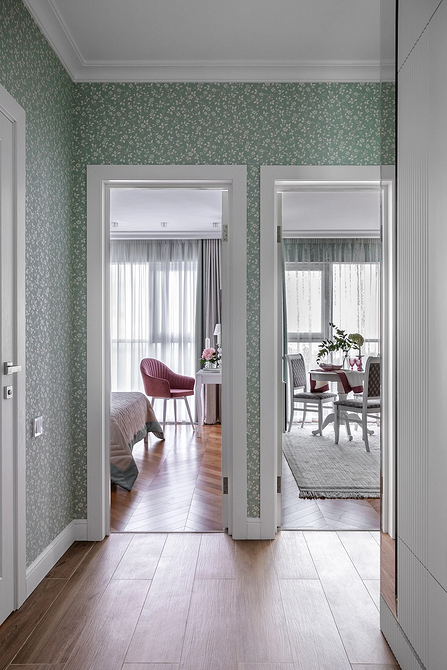 На смену простым нейтральным оттенкам приходят их более сложные вариации, такие как грейдж — гибрид серого и бежевого. Это «умный» цвет, который подстраивается под освещение: он может казаться освежающим, уютным, согревающим. Также актуальны вариации топленого молока, слоновой кости и пудрового белого с едва уловимым розовым подтоном. Такая база визуально расширяет границы даже самой тесной прихожей, делает ее более воздушной.