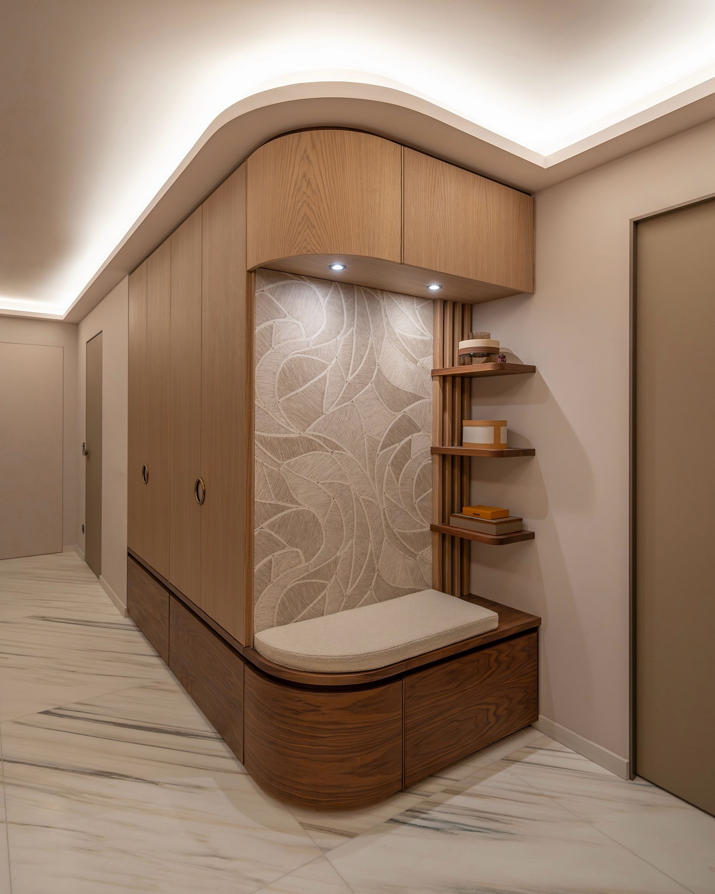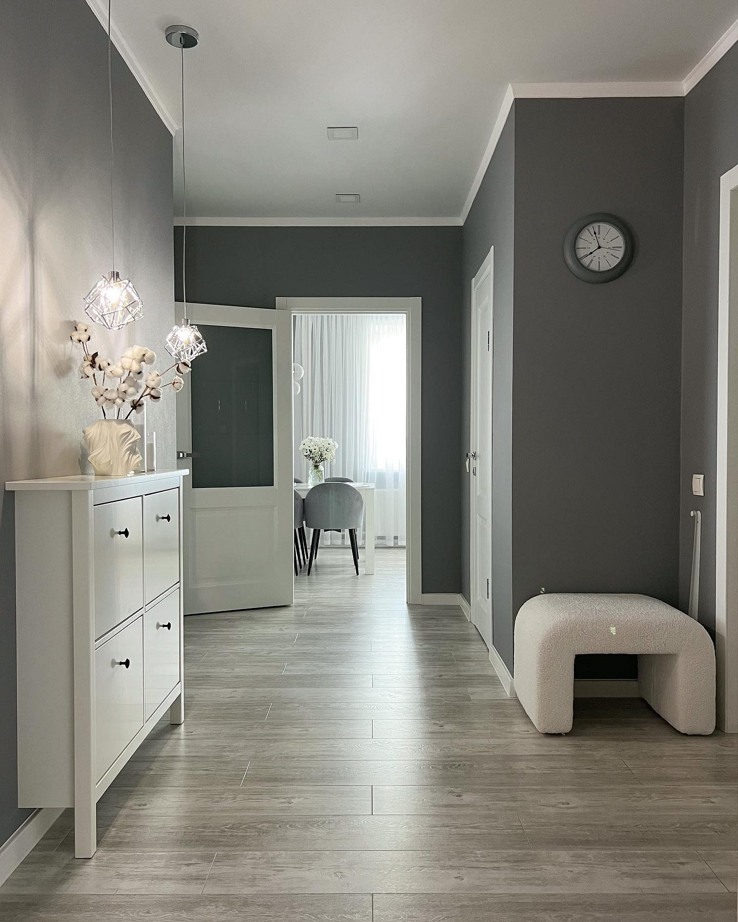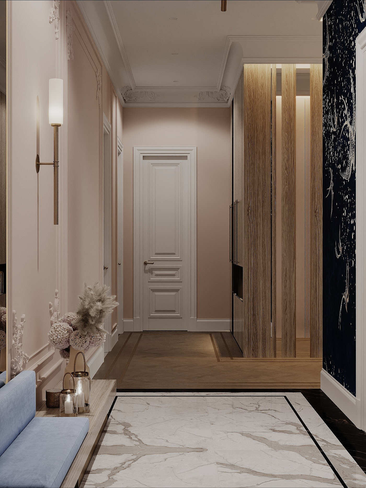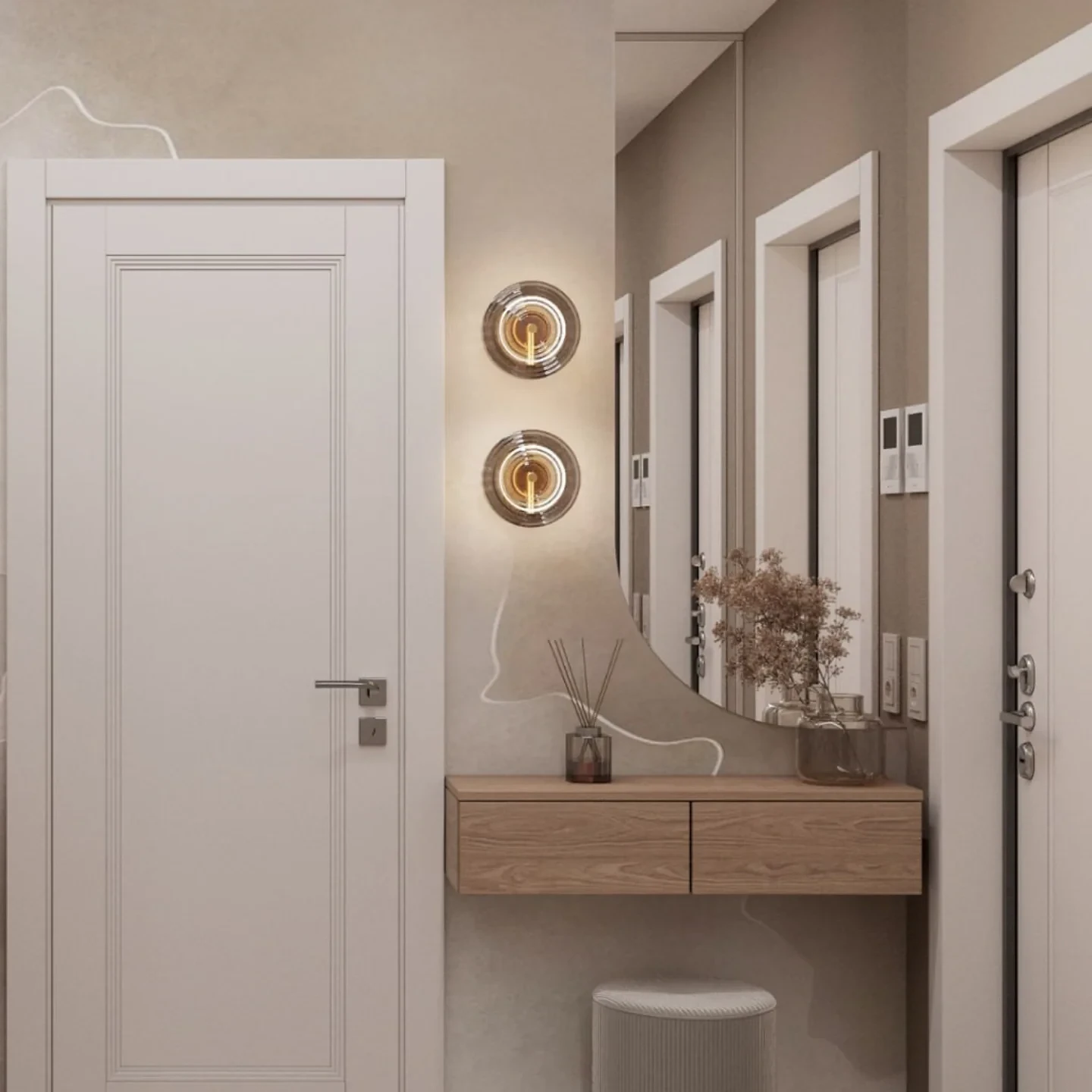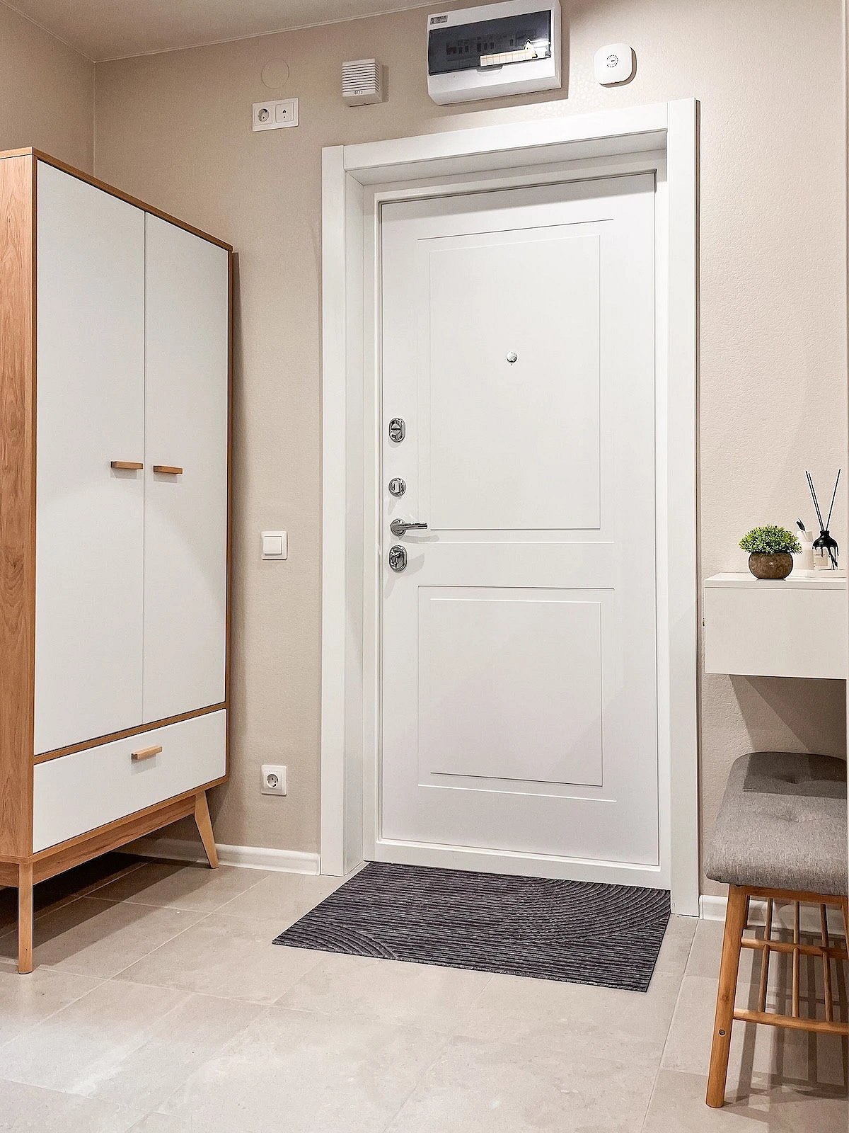 На смену простым нейтральным оттенкам приходят их более сложные вариации, такие как грейдж — гибрид серого и бежевого. Это «умный» цвет, который подстраивается под освещение: он может казаться освежающим, уютным, согревающим. Также актуальны вариации топленого молока, слоновой кости и пудрового белого с едва уловимым розовым подтоном. Такая база визуально расширяет границы даже самой тесной прихожей, делает ее более воздушной.
