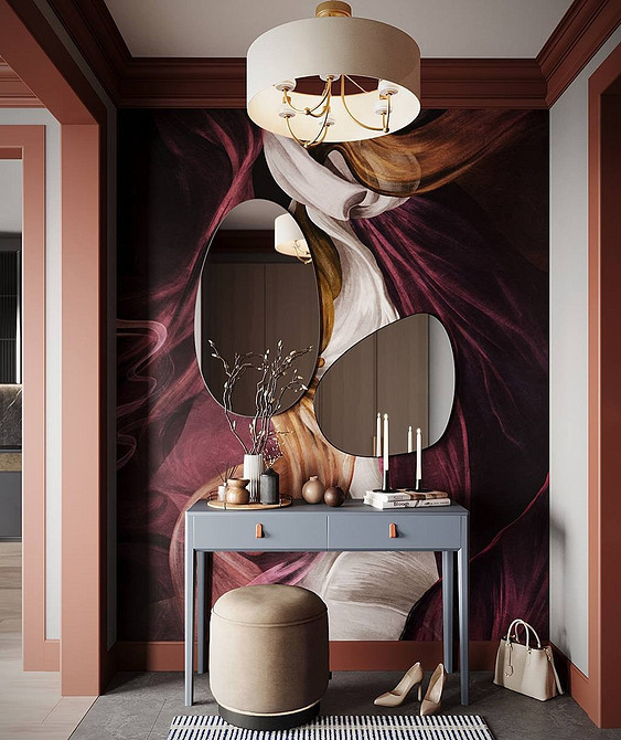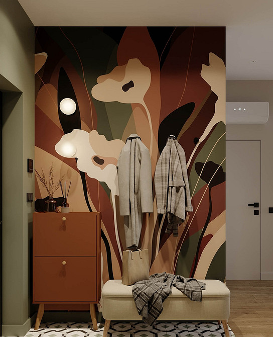 В отличие от обычных обоев с узором панно представляют собой единую композицию без стыков. В 2026 году актуальны сюжеты с туманными пейзажами, абстрактными мазками или оптической иллюзией. Последний прием особенно актуален в маленькой или узкой входной зоне, где нужно визуально создать ощущение простора. Для этого подходят панно с изображениями лестниц, окон или уходящей вдаль дороги.