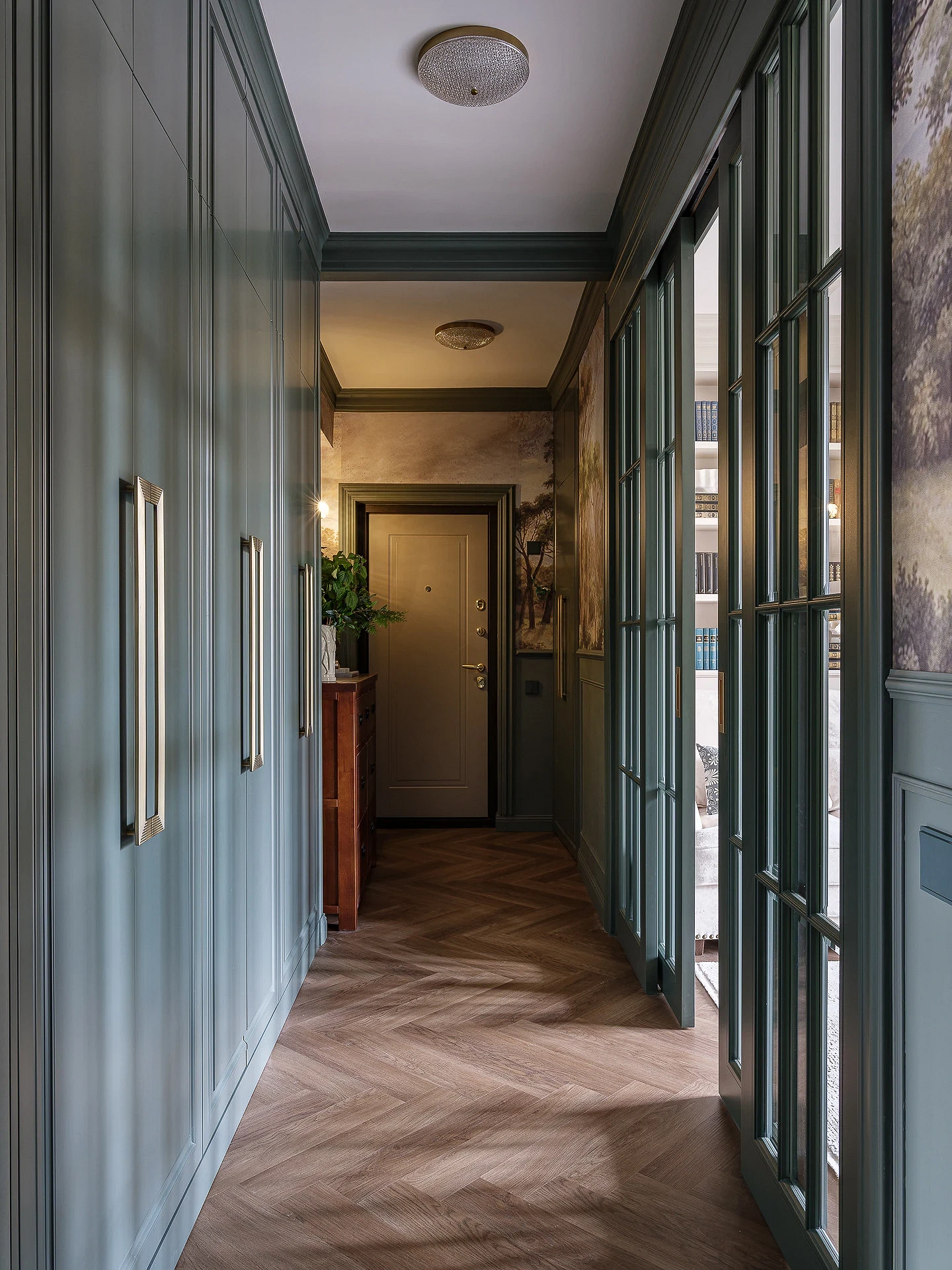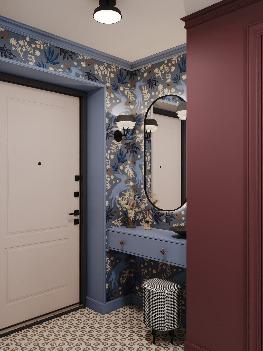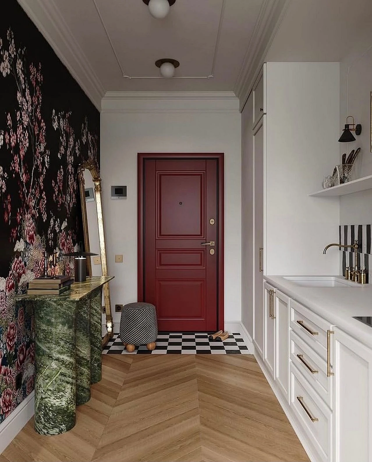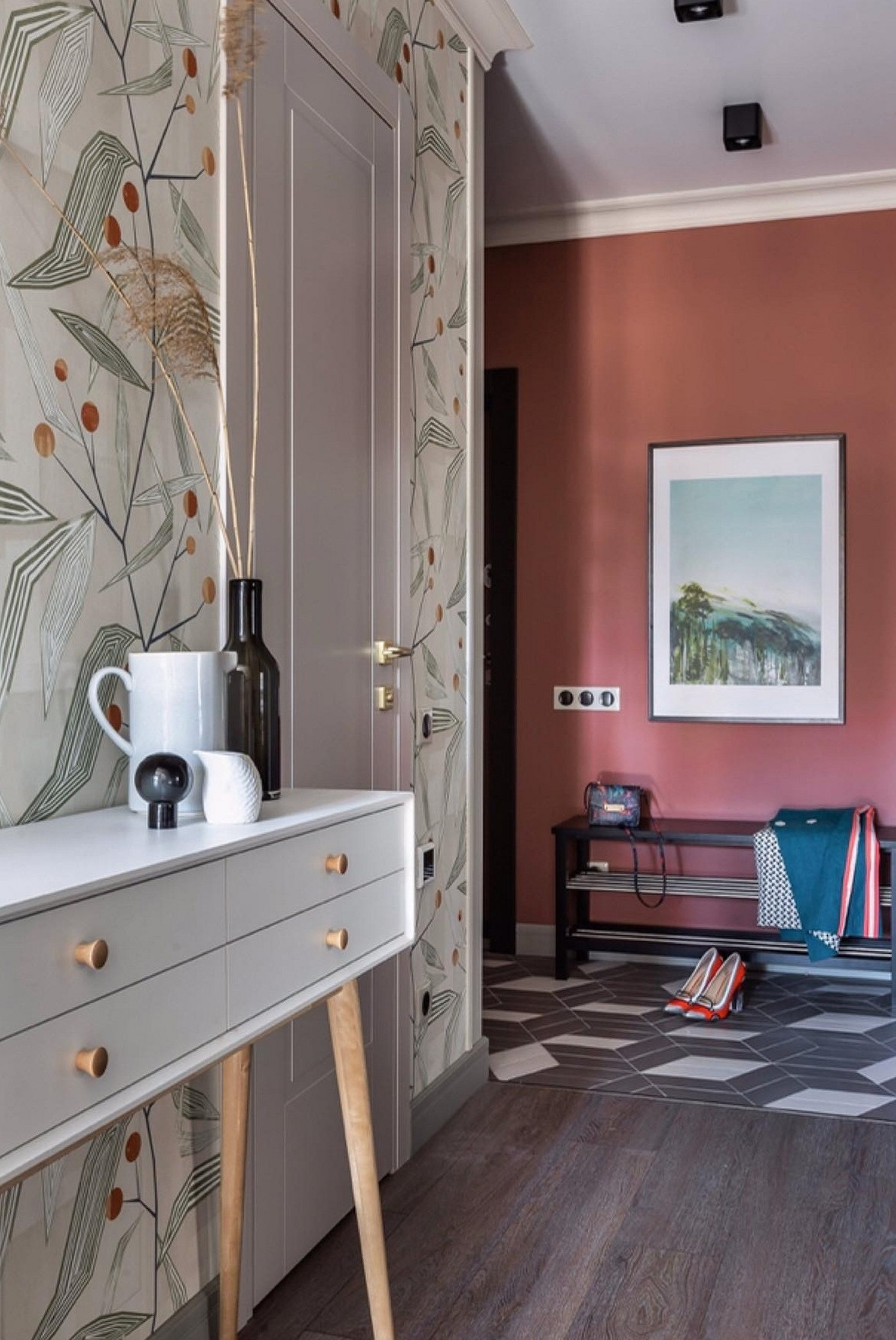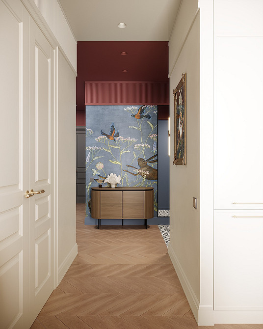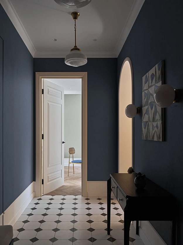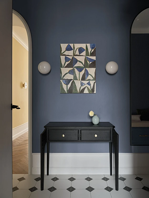 Винный, темно-синий, графитовый, изумрудный и другие насыщенные драматичные оттенки окончательно перестали быть табу для прихожих. В 2026 году дизайнеры активно используют их для создания эффекта шкатулки, который превращает входную зону в настоящий арт-объект. Темные стены добавляют пространству глубины, а на их фоне зеркала и картины в декоративных смотрятся особенно выигрышно. Такая палитра подойдет тем, кто хочет уйти от типовых решений в сторону индивидуального и характерного интерьера.