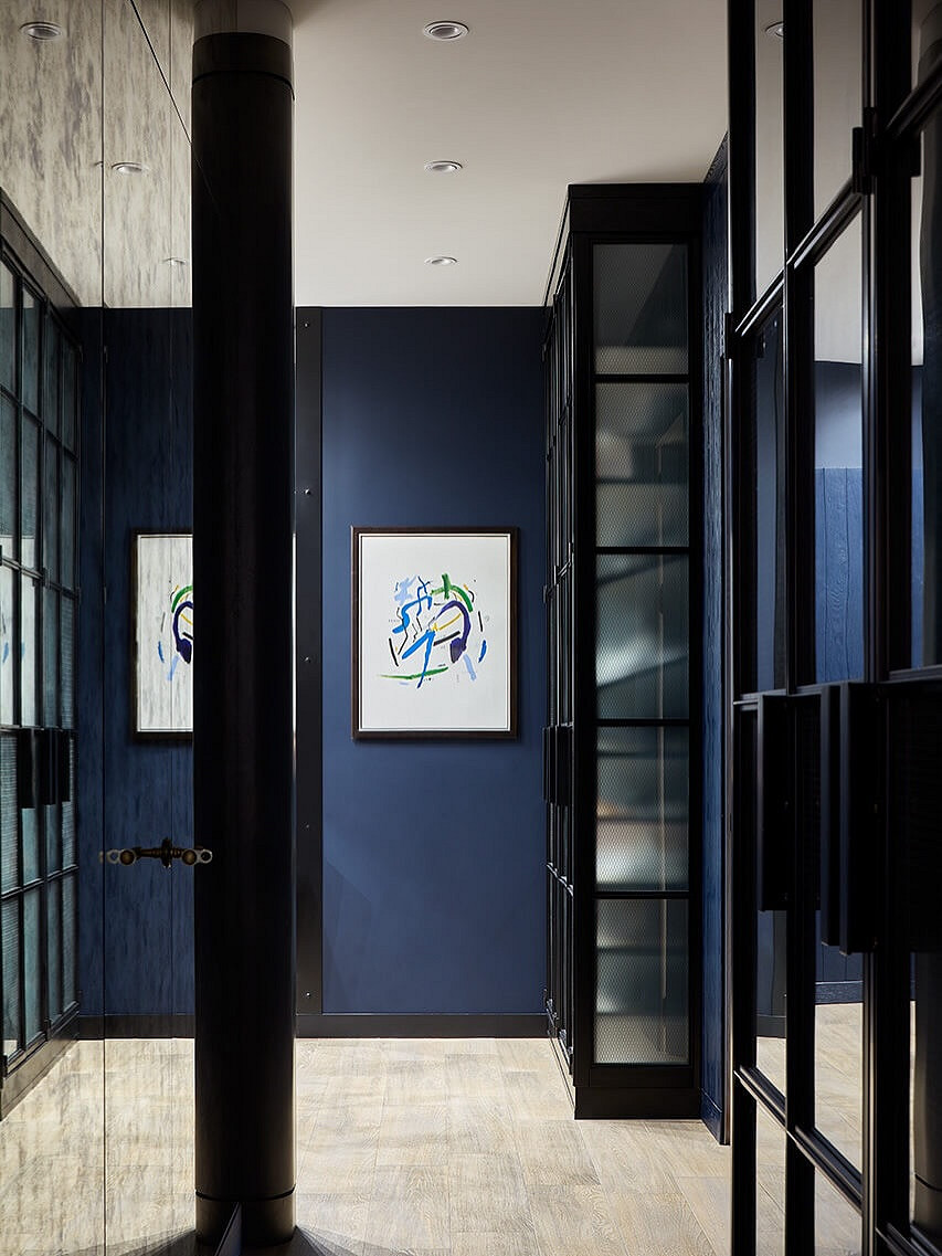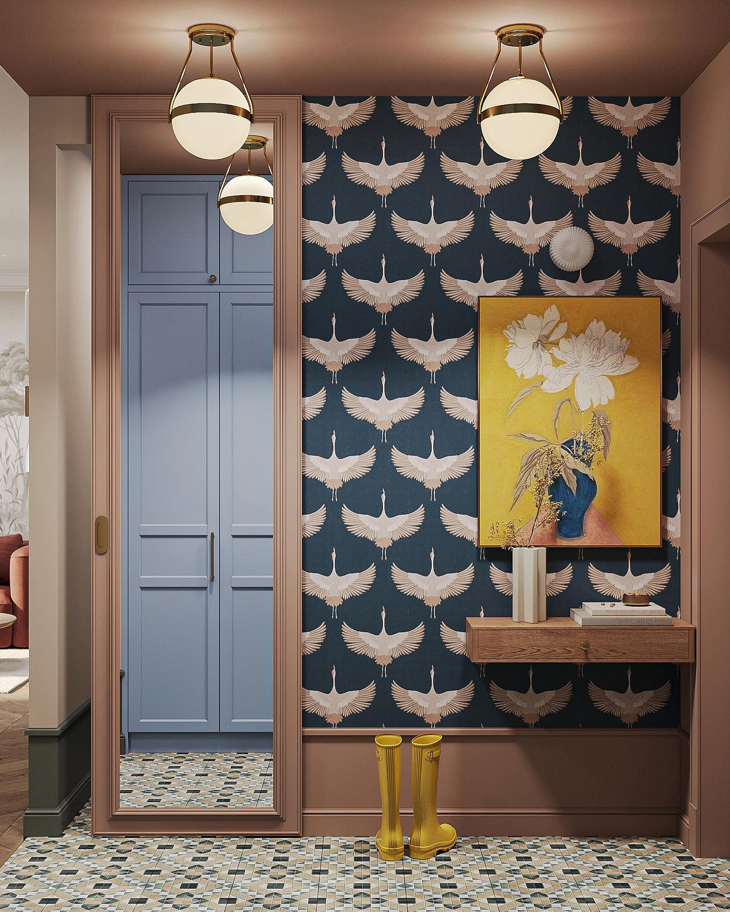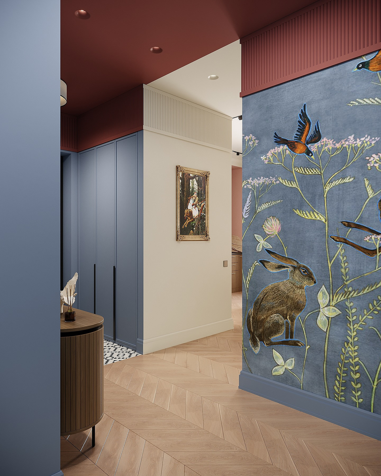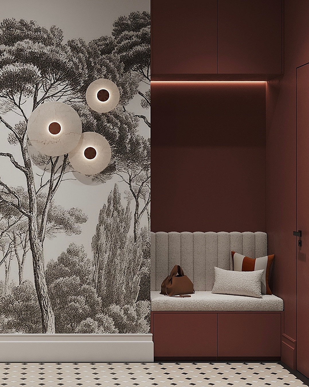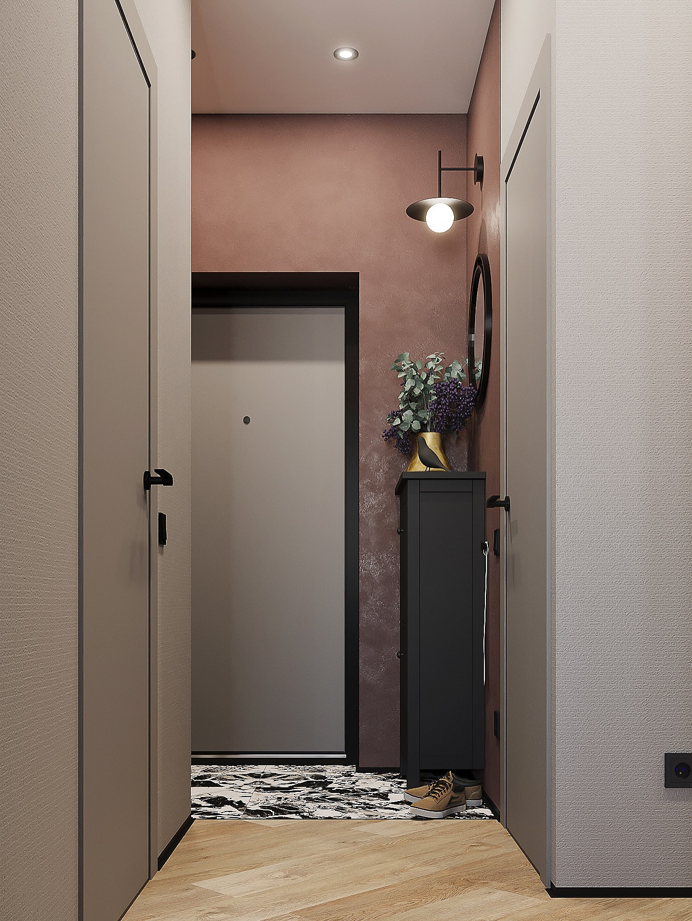 Винный, темно-синий, графитовый, изумрудный и другие насыщенные драматичные оттенки окончательно перестали быть табу для прихожих. В 2026 году дизайнеры активно используют их для создания эффекта шкатулки, который превращает входную зону в настоящий арт-объект. Темные стены добавляют пространству глубины, а на их фоне зеркала и картины в декоративных смотрятся особенно выигрышно. Такая палитра подойдет тем, кто хочет уйти от типовых решений в сторону индивидуального и характерного интерьера.