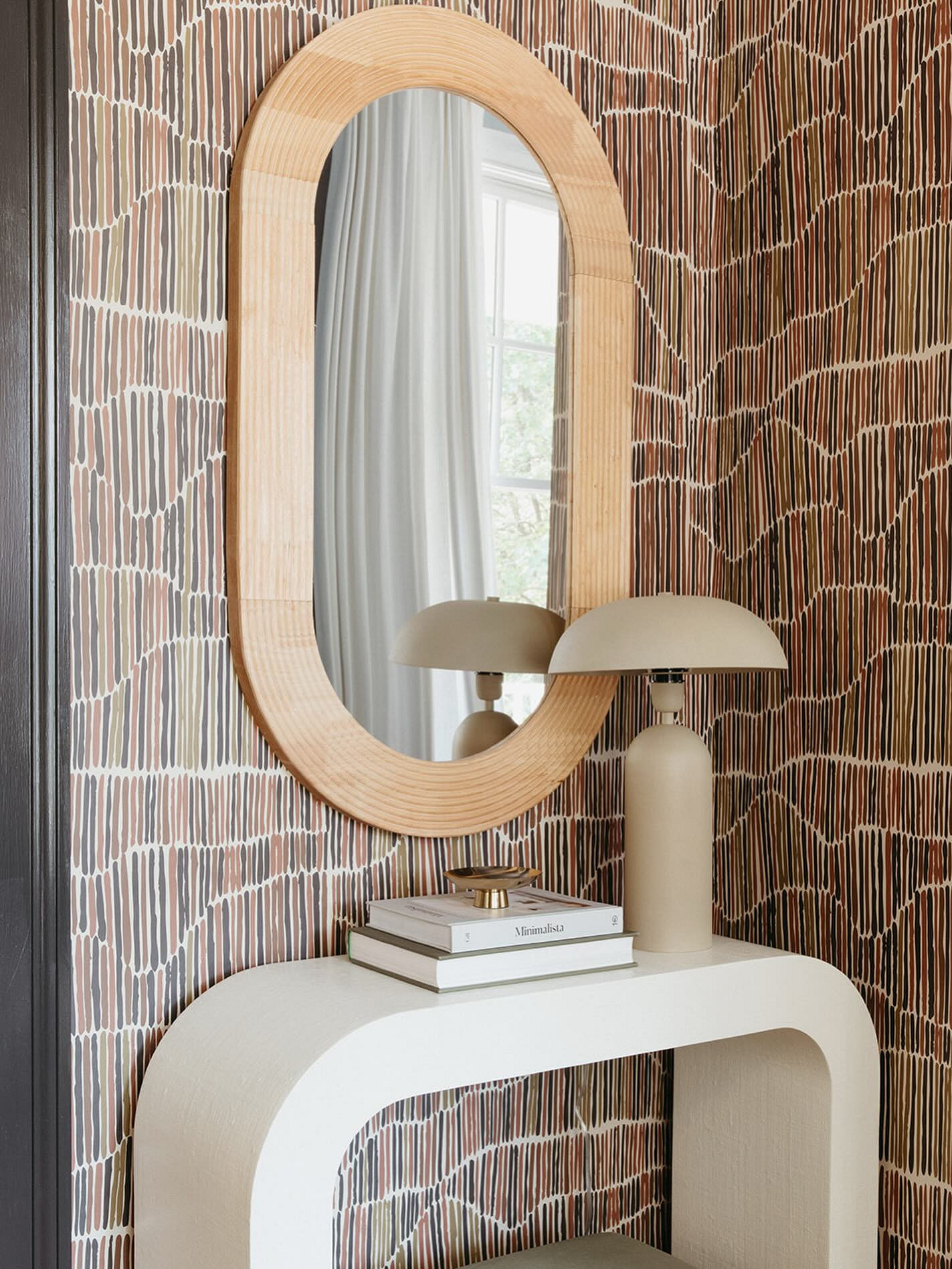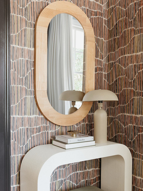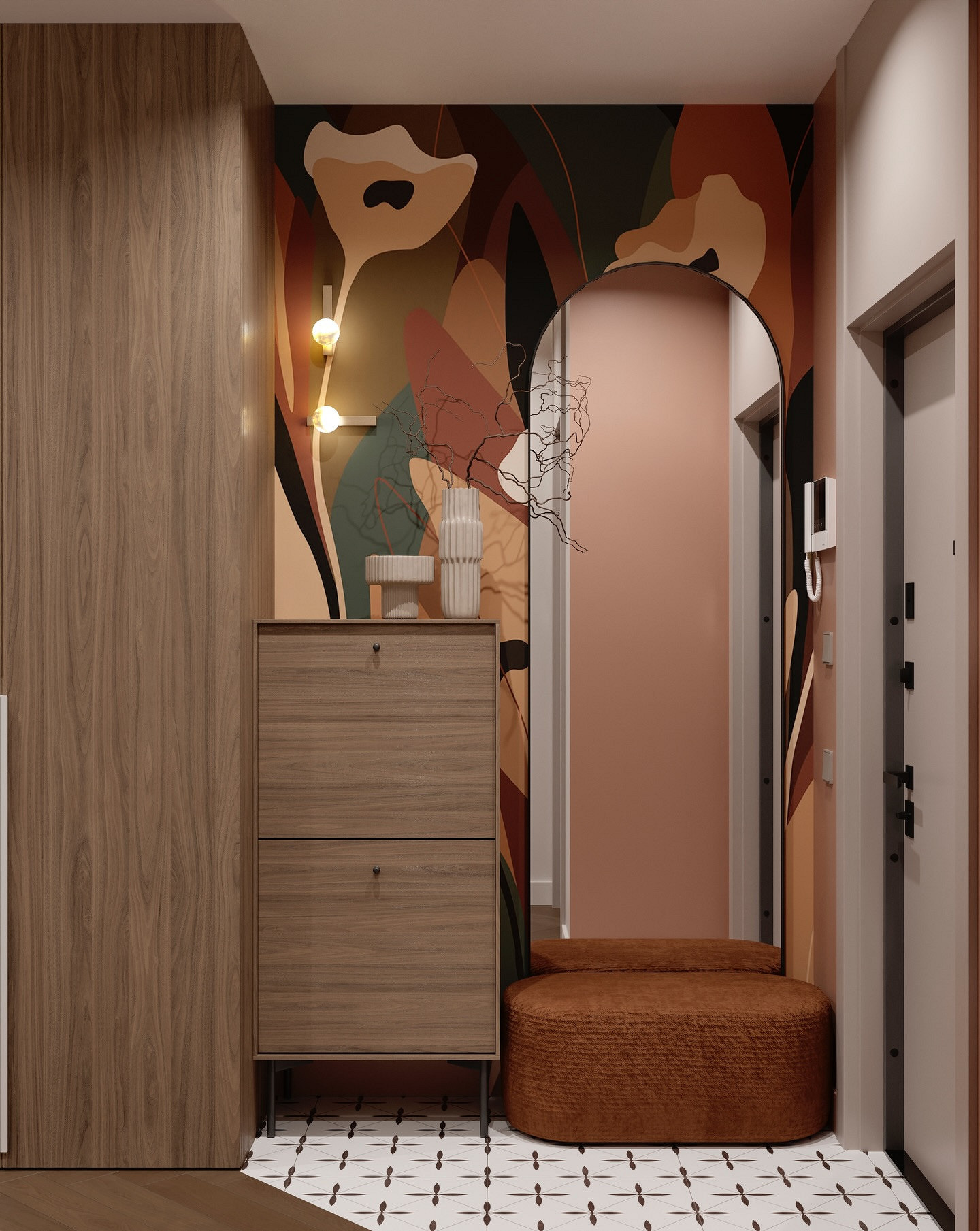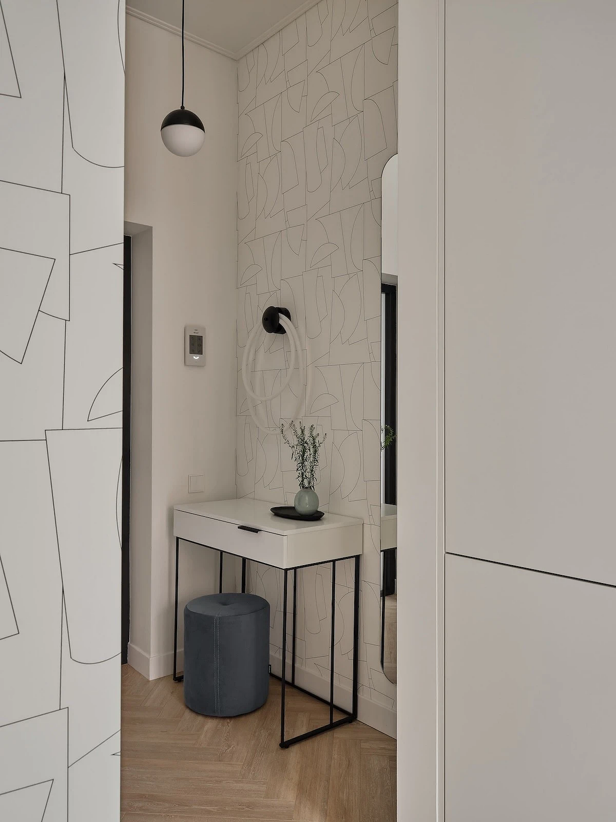 Зигзаги, ромбы и контрастные полосы уступают место плавным линиям и окружностям. Такие узоры часто сопровождаются мягкими градиентными переходами цвета, которые дают эффект объема и глубины. Использование обоев с арочными мотивами или волнообразными линиями — отличный способ визуально скорректировать геометрию длинного узкого коридора. Вертикально направленные узоры визуально приподнимут потолок, а горизонтальные волны немного расширят стены.