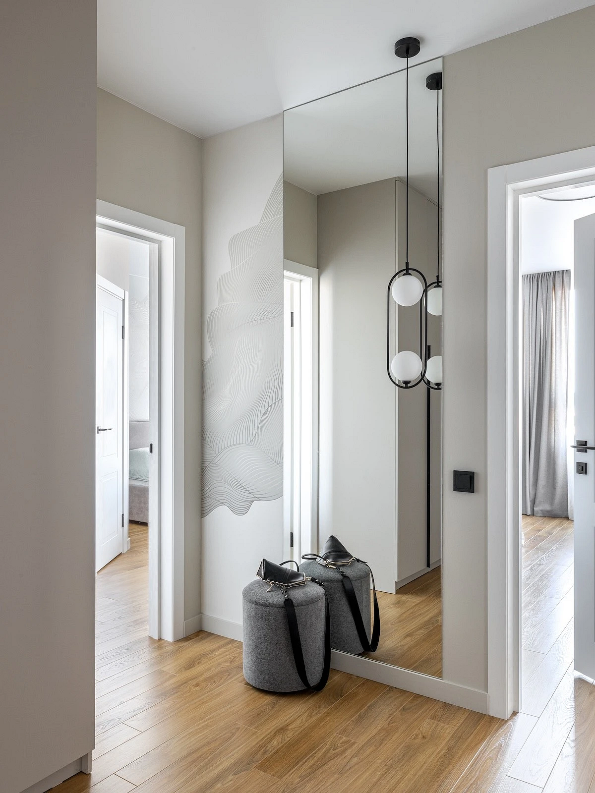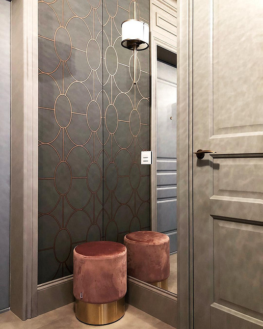 Сложные нейтральные тона сочетаются с любыми фактурами: от металла до дерева и натуральных тканей. Чтобы интерьер не выглядел плоским и монотонным, выбирайте обои с выраженной фактурой или ненавязчивым рисунком. В маленькой прихожей лучше использовать светлый грейдж на всех стенах, поддержав его высоким белым плинтусом — этот прием зрительно приподнимает потолок.