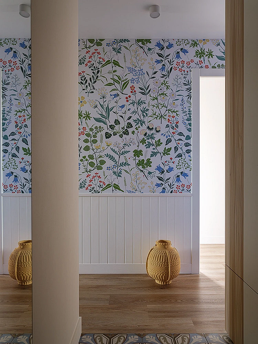 Тропические джунгли сменила эстетика гербариев и графичной флоры. Стильные обои в прихожую в 2026-м — это масштабные, но деликатные изображения крупных листьев, трав или полевых цветов, выполненные в природной или приглушенной гамме. Другой, не менее модный вариант — не макро-, а микроботаника. Мелкие неконтрастные узоры особенно хорошо смотрятся в винтажной и скандинавской эстетике.
