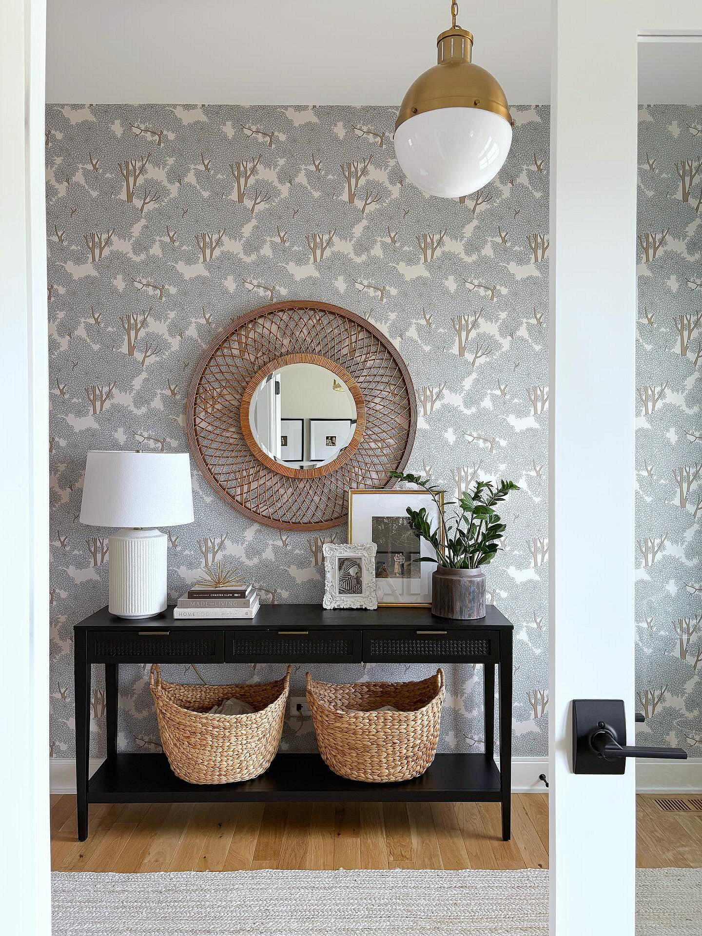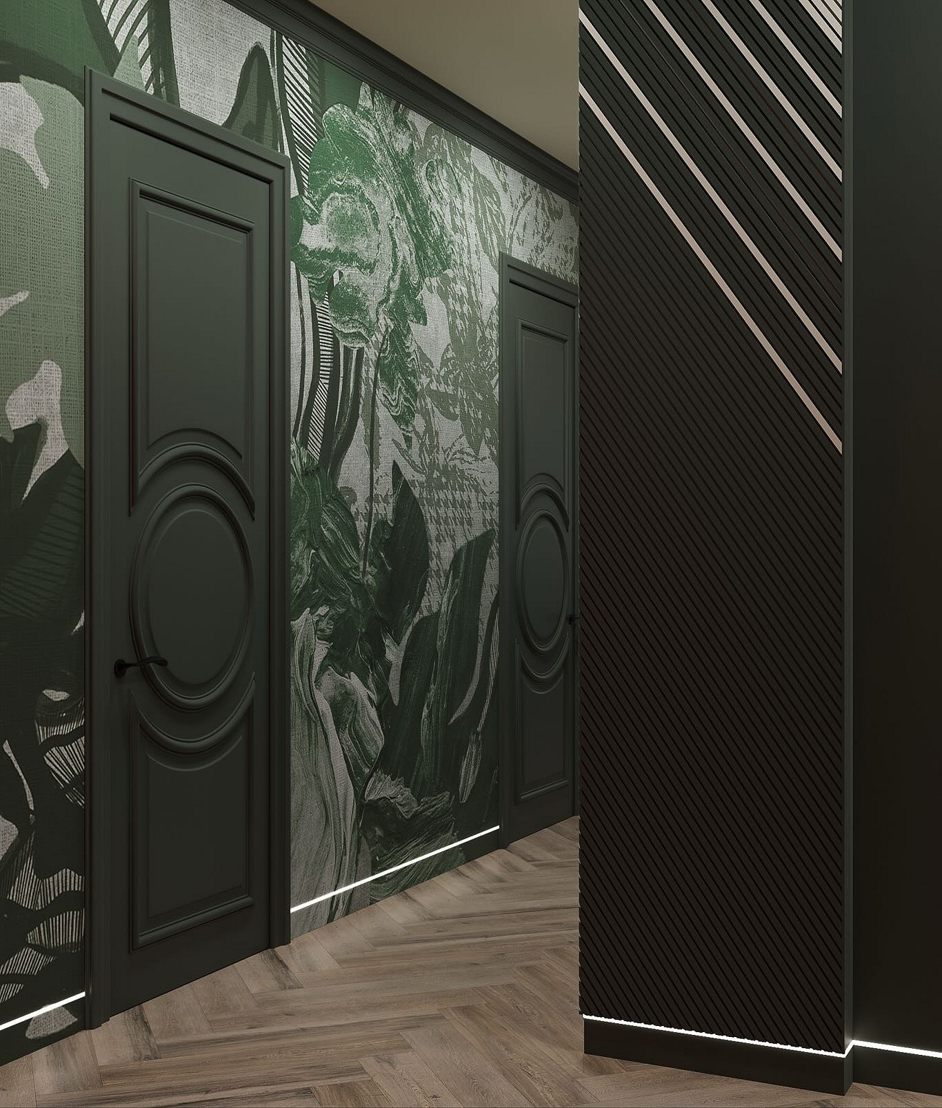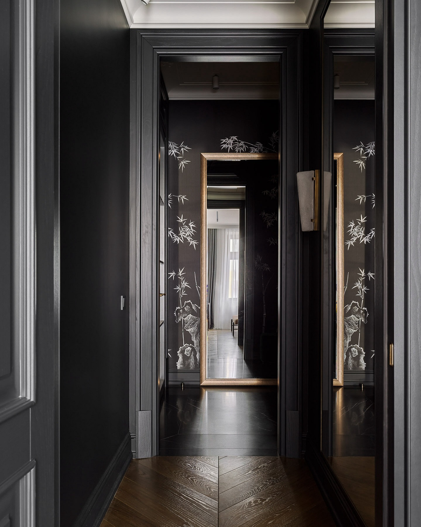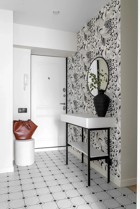 Чтобы активный акцент не сделал пространство мрачным, важно соблюдать баланс. Используйте такие обои на одной стене, а остальные оформите в светлых тонах. Также поддержите темную базу хорошим освещением. Отражение темной стены в большом зеркале на противоположной стороне создаст эффект глубины и добавит интерьеру прихожей драматизма.