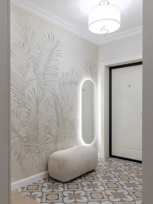 Используйте отделку акцентно: в торце, за консолью с зеркалом или на участке, не заставленном габаритной мебелью. Если прихожая переходит в жилую комнату, панно может стать связующим звеном, дублируя элементы отделки гостиной или кухни. Выбирая обои-фреску, отдавайте предпочтение материалам на флизелиновой основе с защитным покрытием: они более долговечны и не боятся случайных механических повреждений.