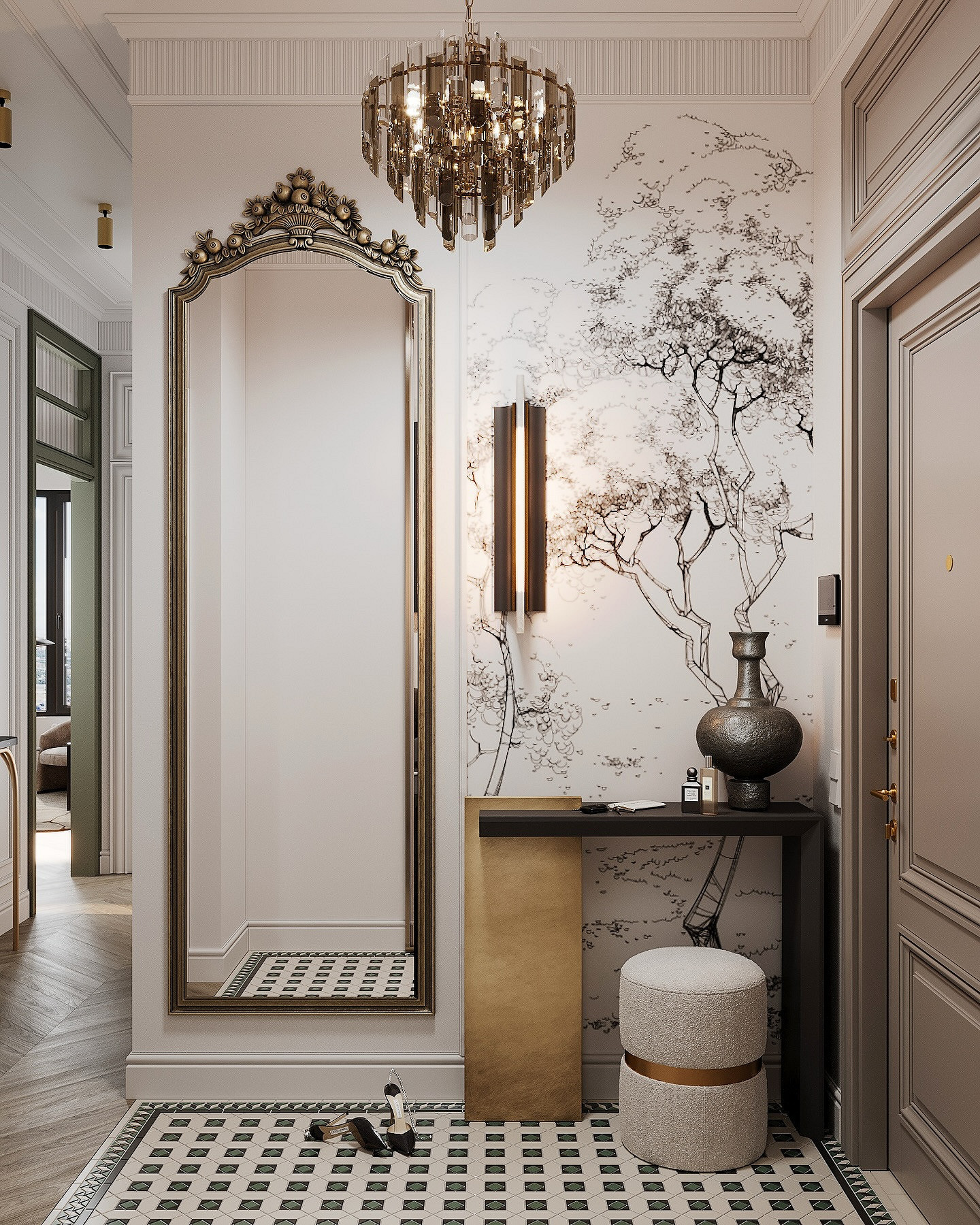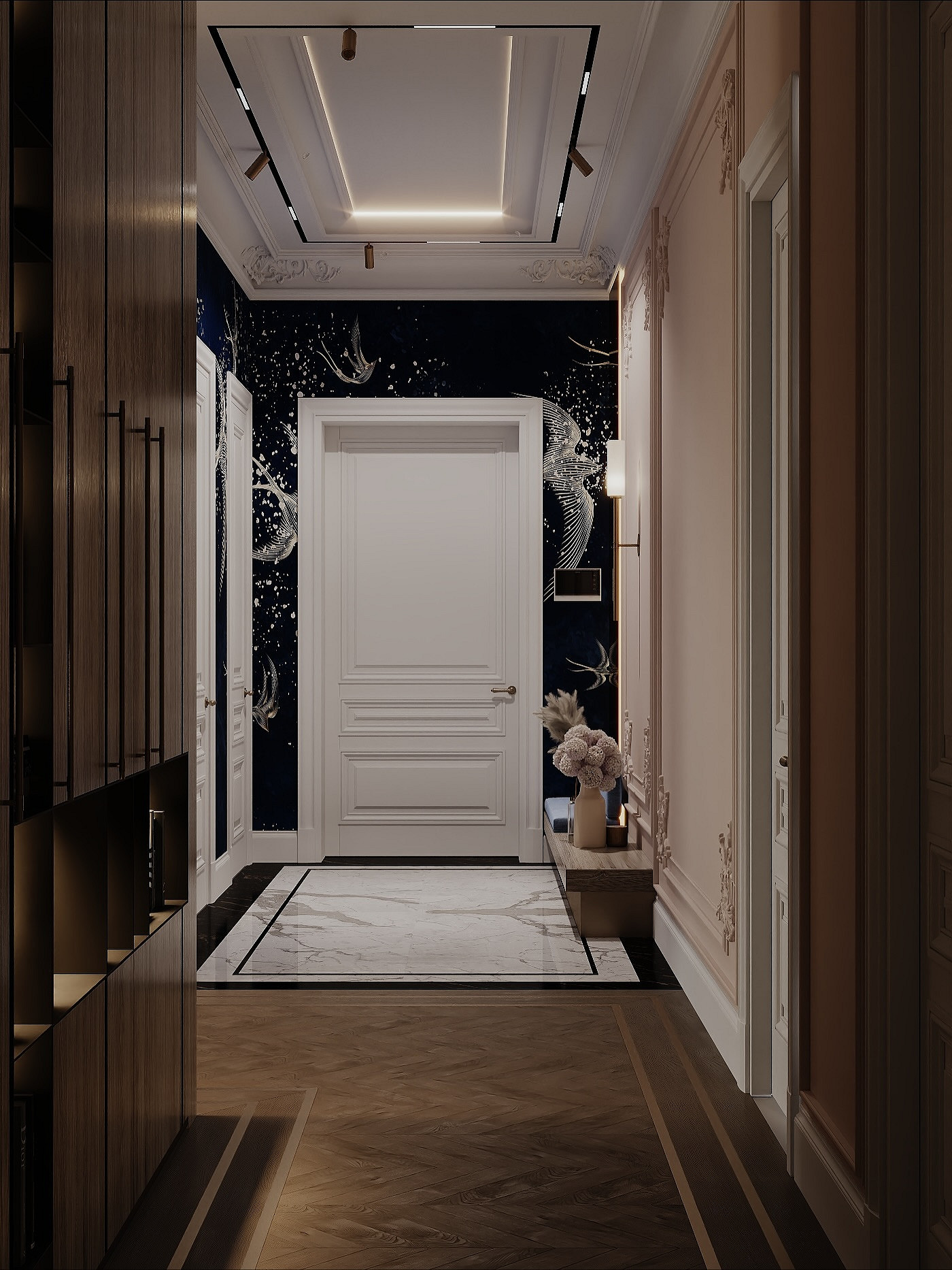 На фото обоев для прихожей в 2026 году можно заметить несколько популярных цветовых схем. Они стилистически универсальны и не потеряют актуальность в ближайшие годы.
