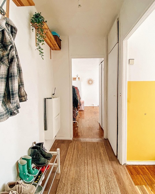 Дизайн этого узкого коридора в хрущевке также не потребовал сложных работ и больших затрат. Вся мебель из ИКЕА, кроме полок — они куплены на сайте объявлений. Входная зона получилось очень опрятной и минималистичной.
