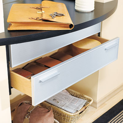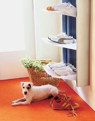 Эта плоская калошница удобна тем, что подвешена к стене, а ее ящики откидываются вперед, наглядно демонстрируя свое содержимое.