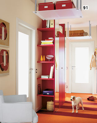 99. Один из стеллажей (самый широкий) можно использовать как мини-офис. Выдвижная полка позволяет расположить клавиатуру, а глубина модуля рассчитана так, чтобы сюда легко помещались и монитор, и системный блок компьютера. Для сидения предназначен регулирующийся по высоте табурет.