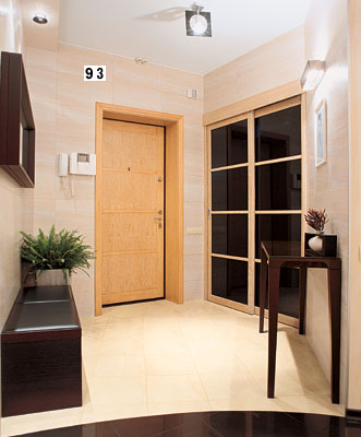 Он выделен и планировочно, и цветом. Пол прихожей покрыт ковролином. На нем темно-красным обозначены полоски-дорожки от входной двери к шкафу